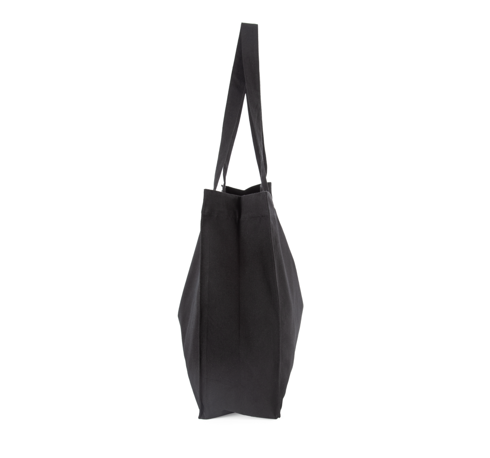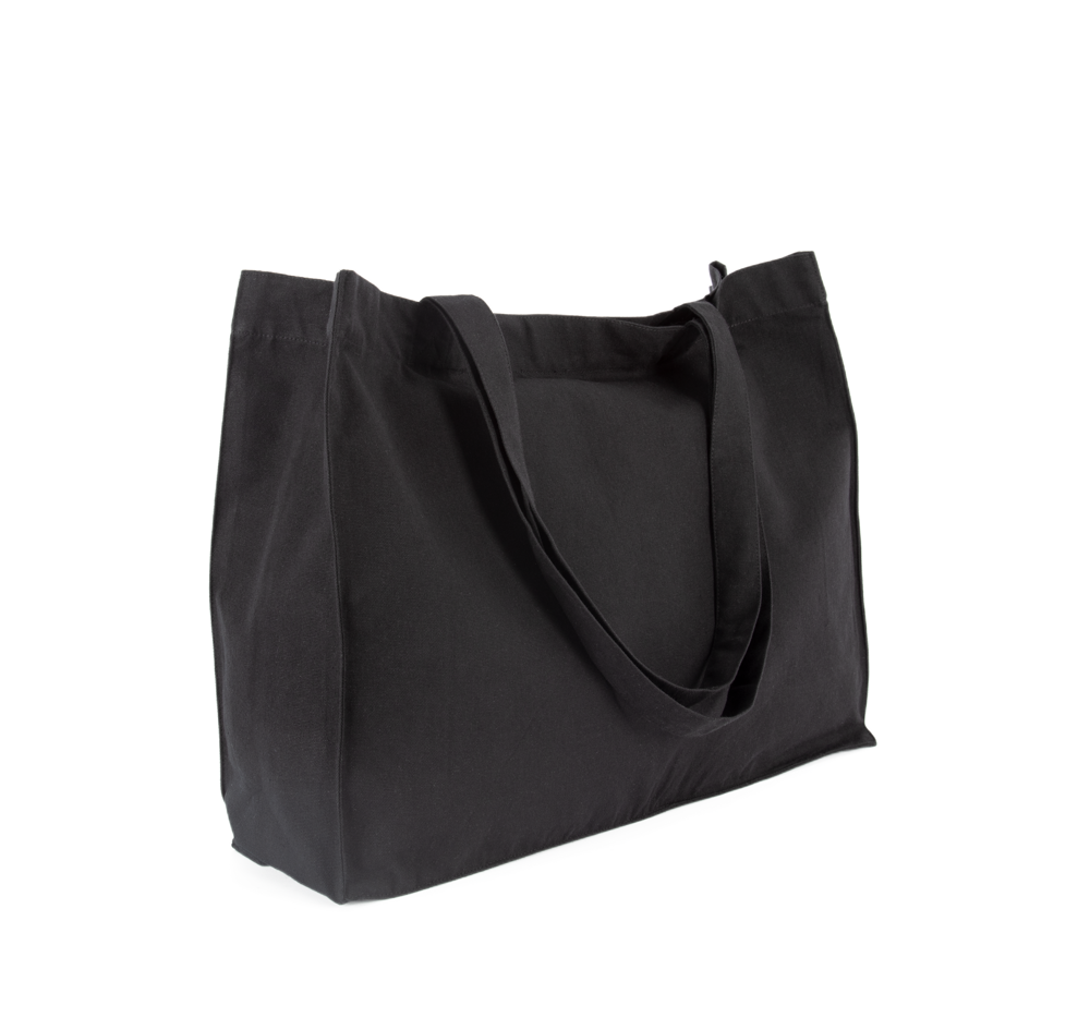 67% cotone riciclato / 30% poliestere riciclato / 3% altre fibre. Borsa rettangolare extra large con ampio soffietto e fondo in cotone e poliestere riciclati. Manici nello stesso materiale del corpo della borsa.