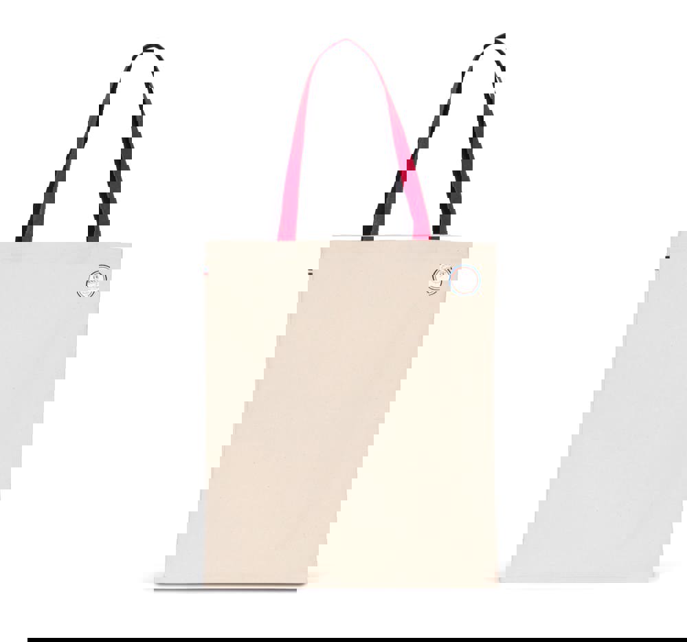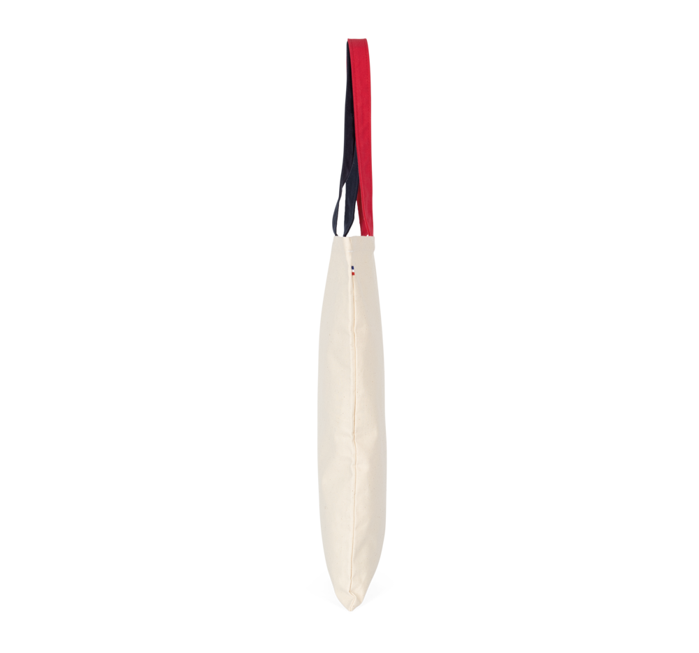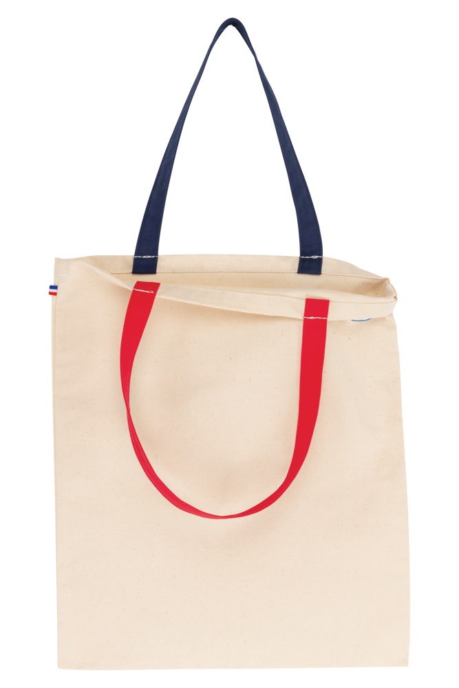 100% cotone. Borsa in tela di cotone. Il prodotto è realizzato in Francia, in uno stabilimento della Bretagna, avendo l'etichetta, "Origine France Garantie". Sul lato della borsa shopper è cucita un'etichetta in tessuto che riproduce la bandiera francese. I manici in tessuto, di 2,5 cm di larghezza e 50 cm di lunghezza, sono realizzati in colori a contrasto.