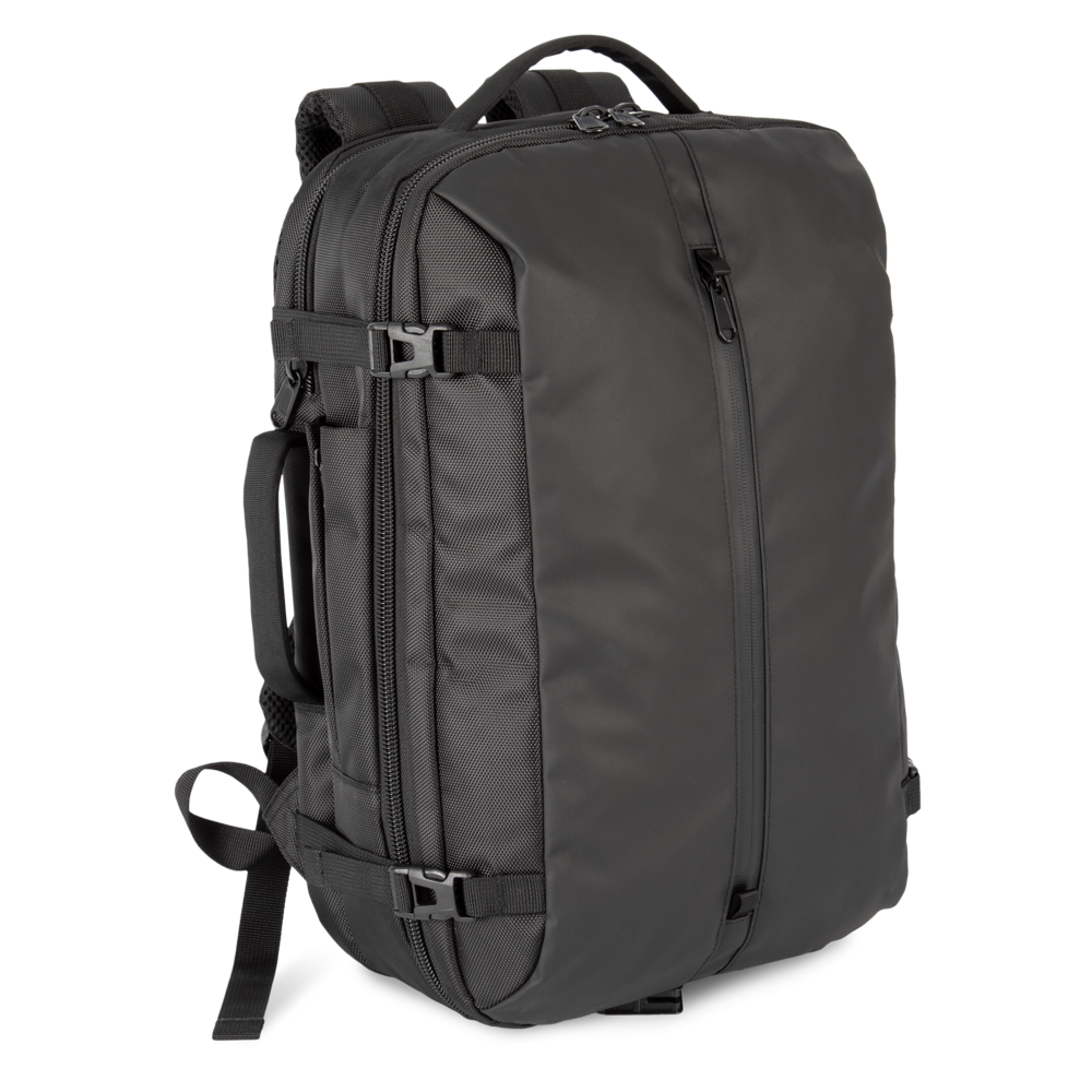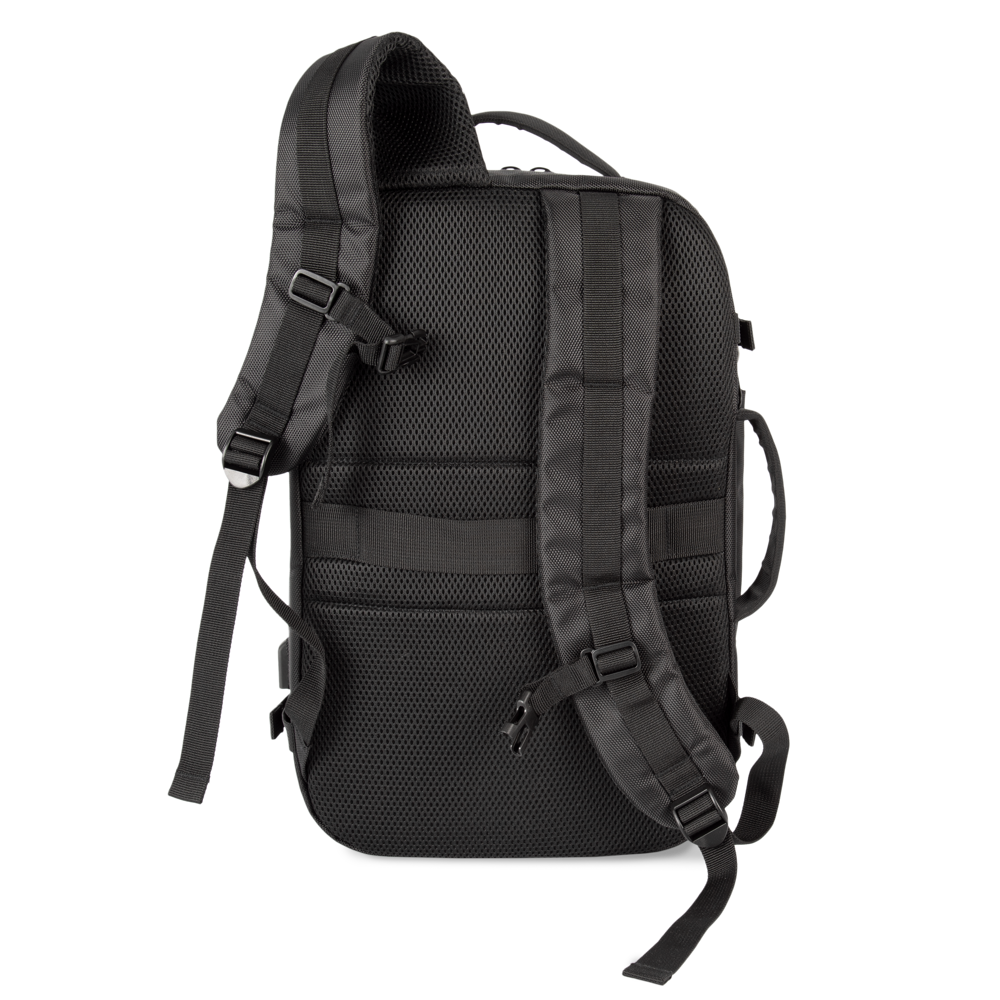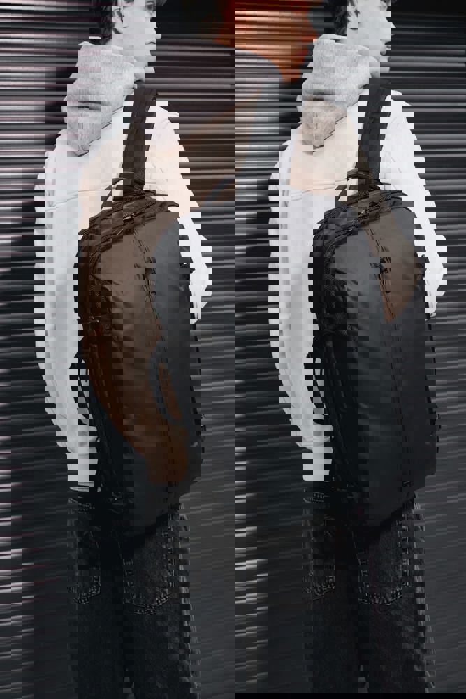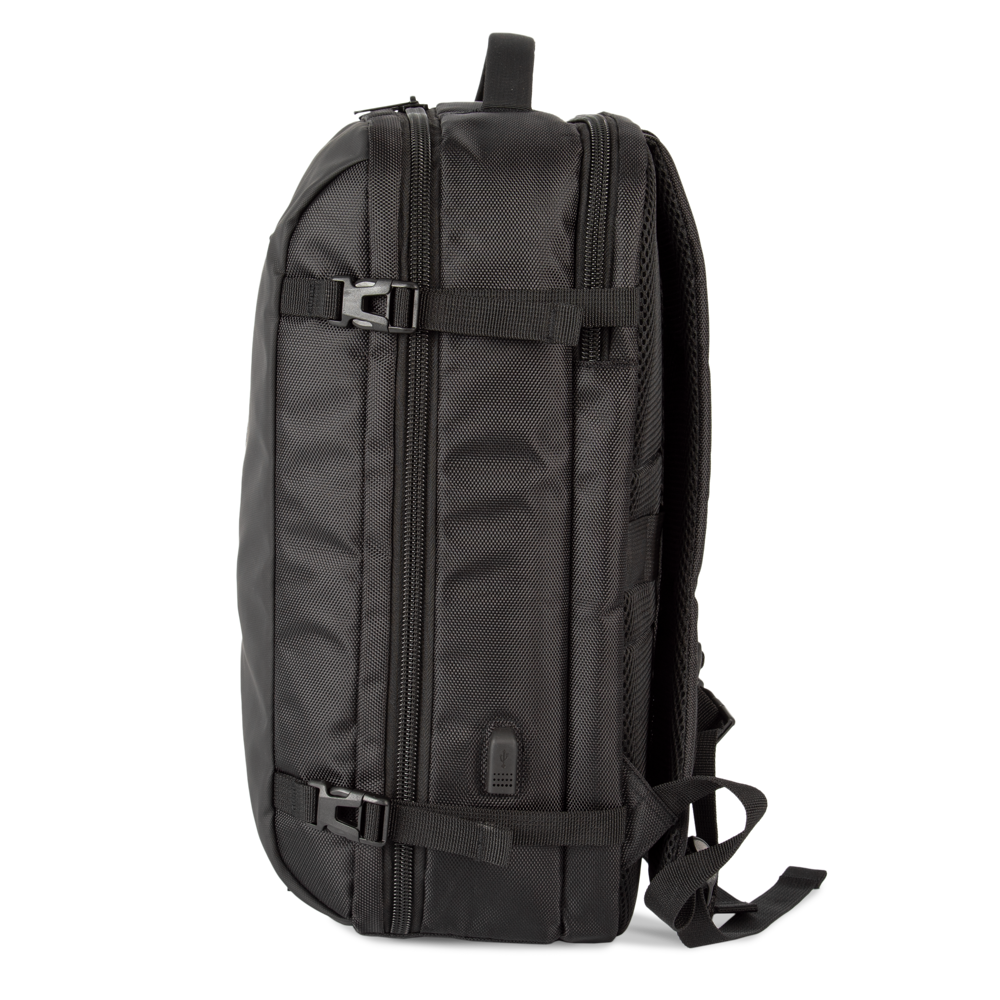 100% poliestere. Zaino da lavoro in poliestere con materiali a contrasto. Ampia tasca frontale con zip. Ampio scomparto principale per i documenti con due tasche in rete. Scomparto posteriore imbottito per computer portatile (fino a 15 pollici) e tablet. Tasca laterale per bottiglia. Connettore esterno del tipo C con cavo interno per power bank. Nastro a strappo sullo schienale per fissare lo zaino alla maniglia di una valigia e trasportarlo facilmente. Schienale e spallacci imbottiti e traspiranti.