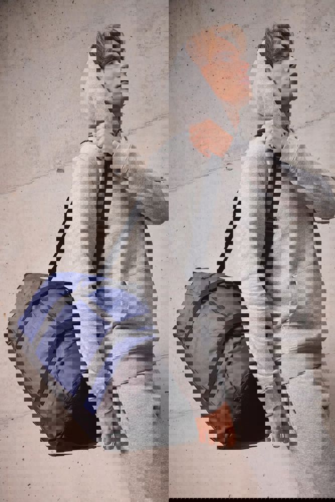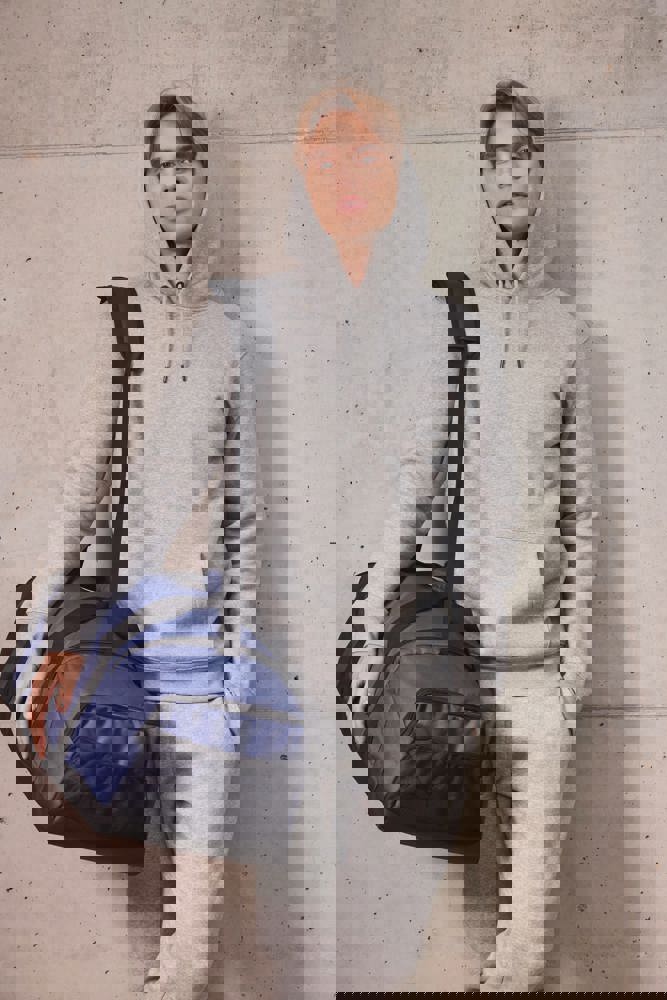 100% poliestere. Borsa sportiva con doppi compartimenti laterali in 50% poliestere riciclato. Pannello in rete traspirante in uno dei due compatimenti laterali, ideale per riporre indumenti umidi e tasca in rete nell'altro. Tappetino salva-piedi incluso per potersi cambiare senza toccare il suolo con i piedi.
