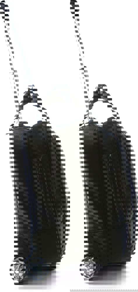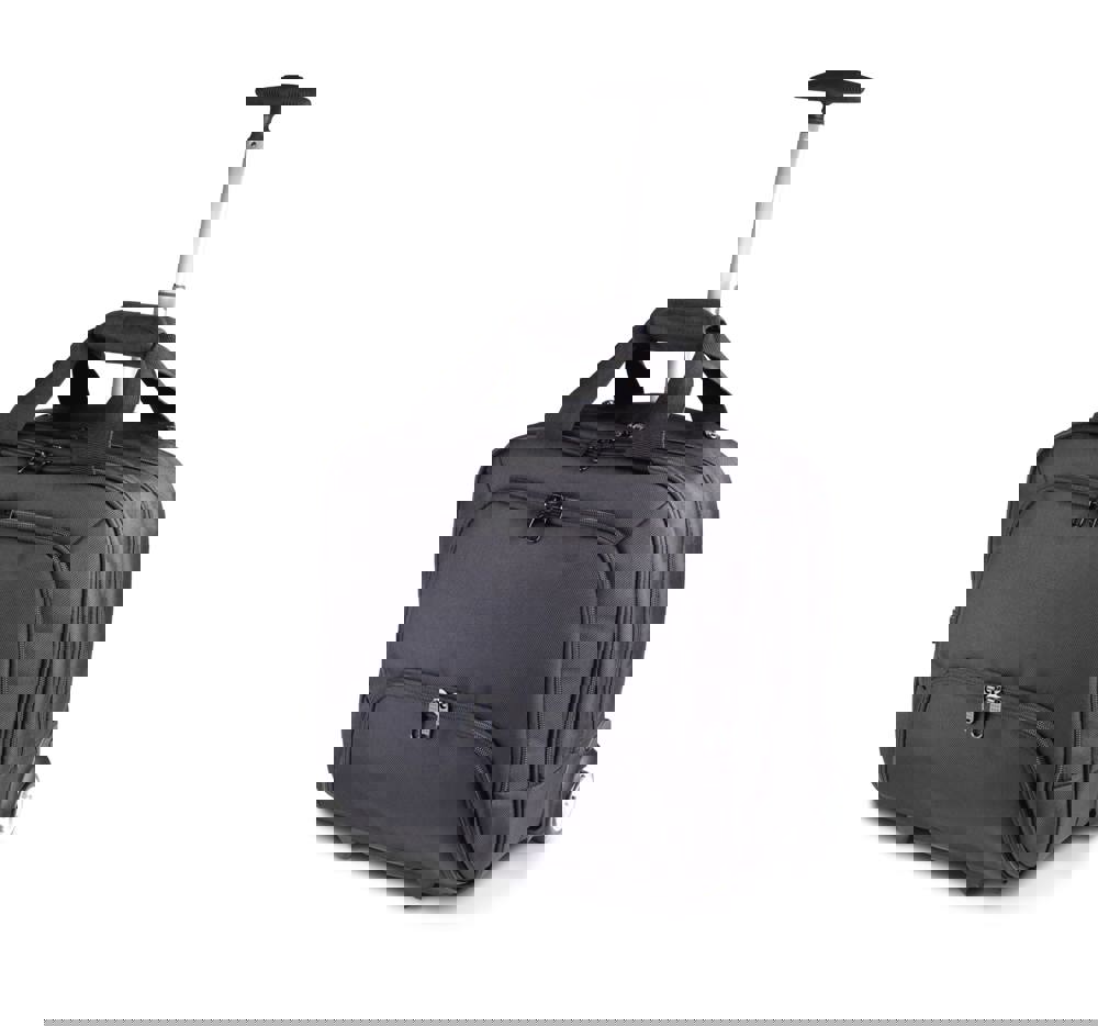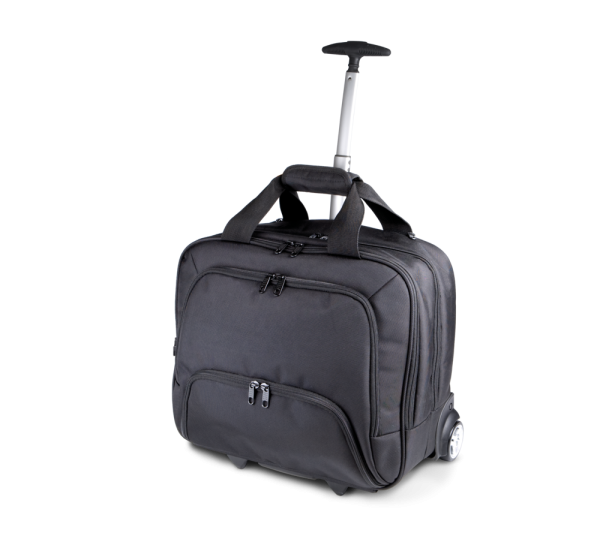 Trolley porta-computer in poliestere 1680D. Sistema trolley curvo in alluminio anodizzato, 2 scompartimenti, il primo porta-computer fino a 15 pollici e documenti, il secondo sufficiente per il necessaire per viaggi brevi, due tasconi frontali, uno organizzato l'altro per i cavi del computer, portachiavi e cintura per aggancio al sistema trolley sul retro.