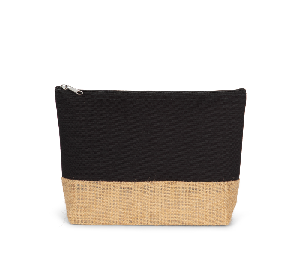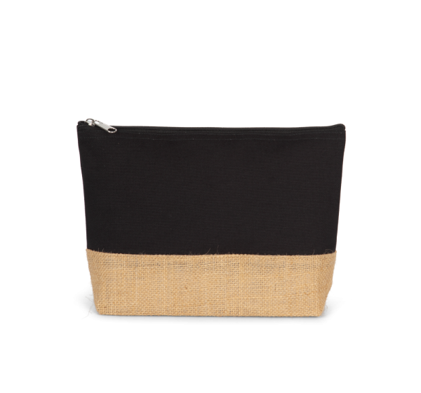 Pochette in tela di cotone con base a contrasto in iuta naturale laminata. Chiusura con zip. Può essere abbinata alla shopper KI0235.