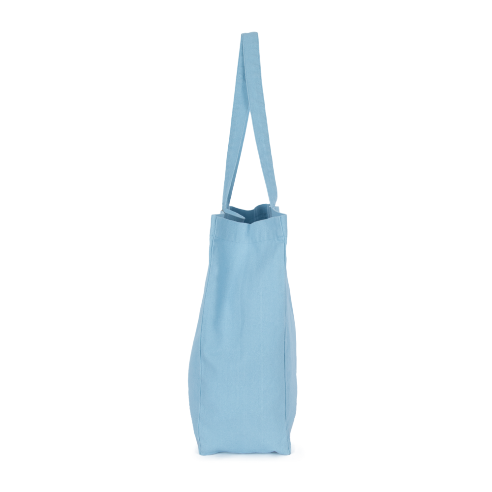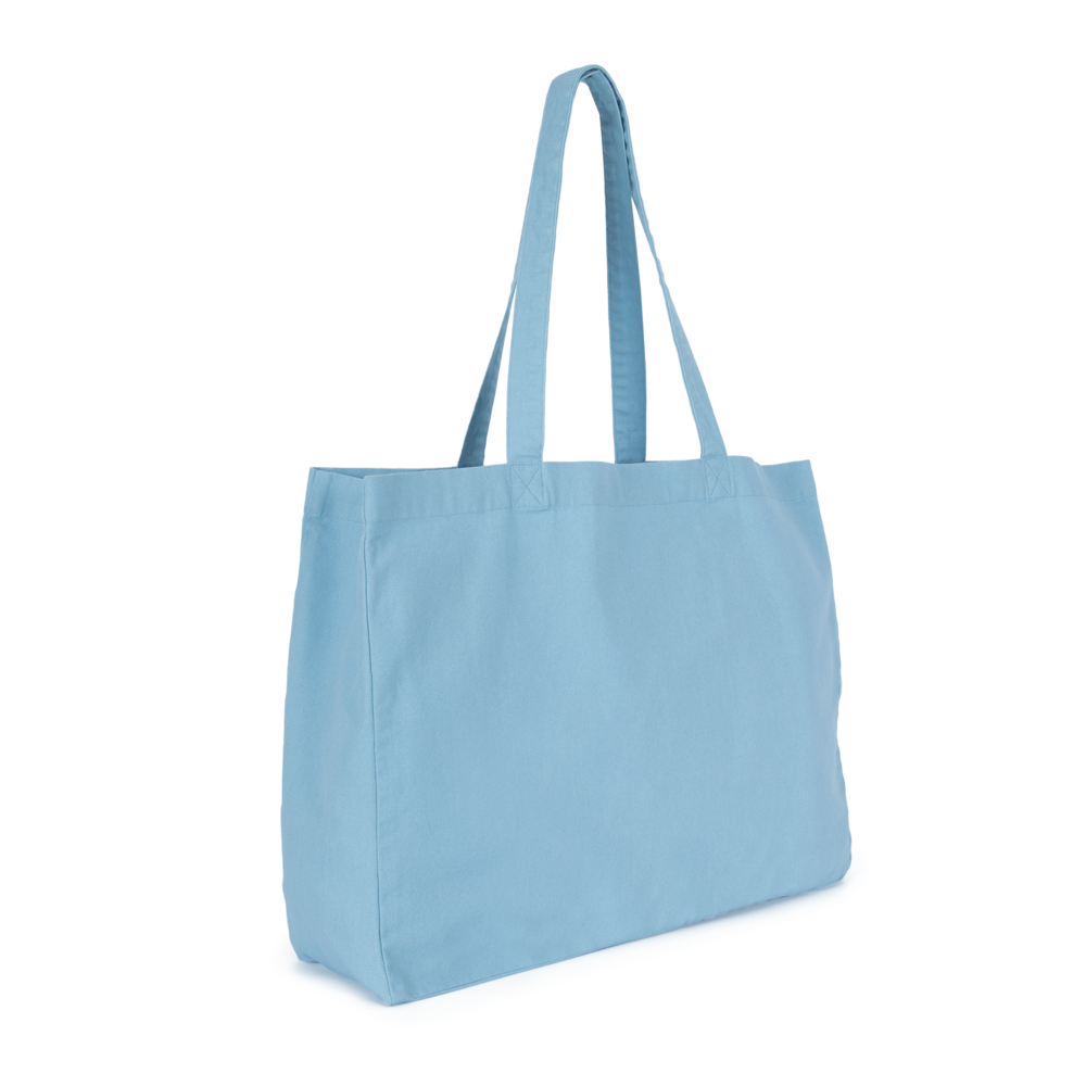 100% cotone. Grande borsa rettangolare con fondo piatto e ampio soffietto. Manici nello stesso materiale della borsa. Ampia capacità interna. I prodotti sbiaditi sono unici e potrebbero presentare leggere variazioni di colore.