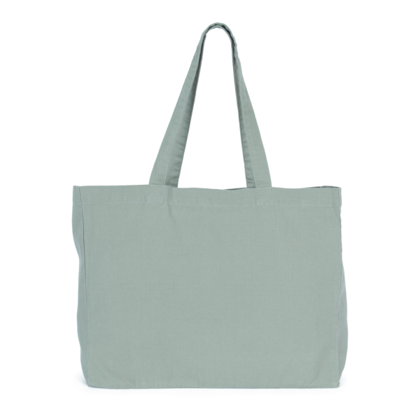 100% cotone. Grande borsa rettangolare con fondo piatto e ampio soffietto. Manici nello stesso materiale della borsa. Ampia capacità interna. I prodotti sbiaditi sono unici e potrebbero presentare leggere variazioni di colore.