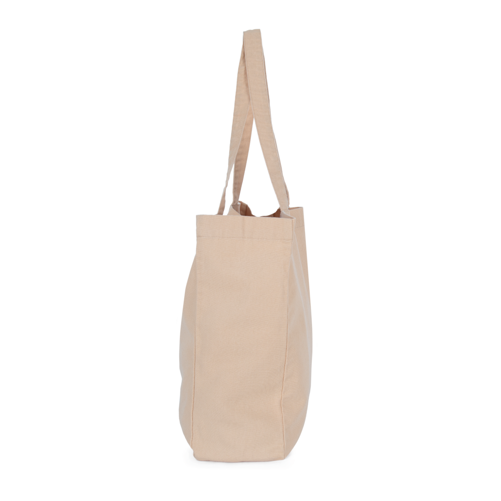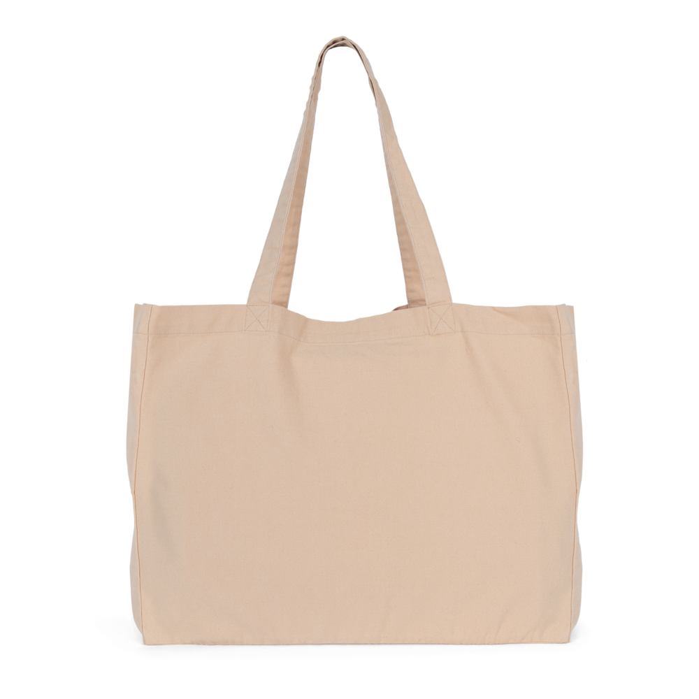 100% cotone. Grande borsa rettangolare con fondo piatto e ampio soffietto. Manici nello stesso materiale della borsa. Ampia capacità interna. I prodotti sbiaditi sono unici e potrebbero presentare leggere variazioni di colore.