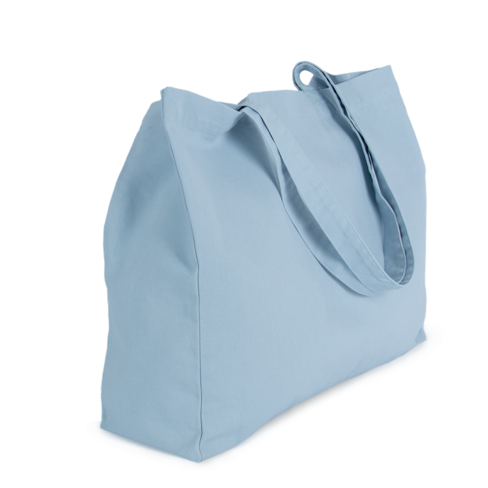 100% cotone. Grande borsa rettangolare con fondo piatto e ampio soffietto. Manici nello stesso materiale della borsa. Ampia capacità interna. I prodotti sbiaditi sono unici e potrebbero presentare leggere variazioni di colore.