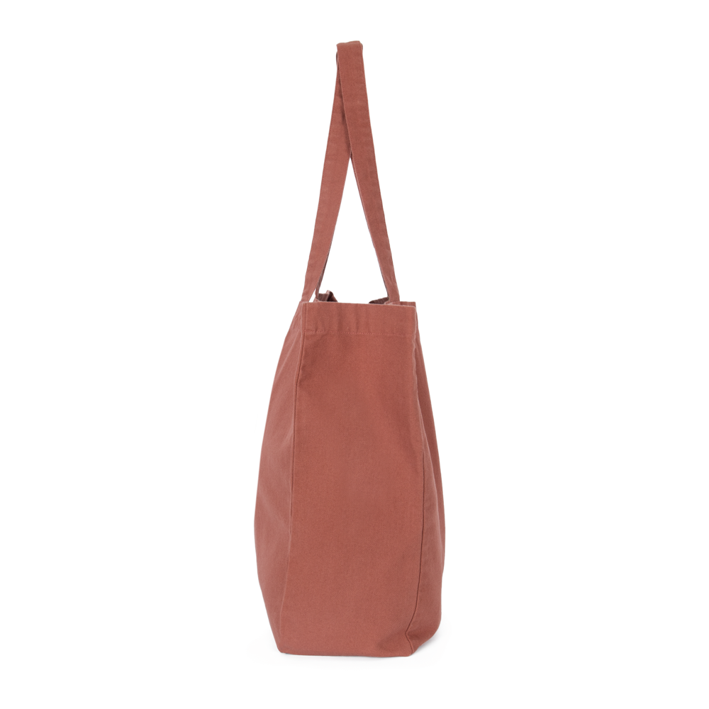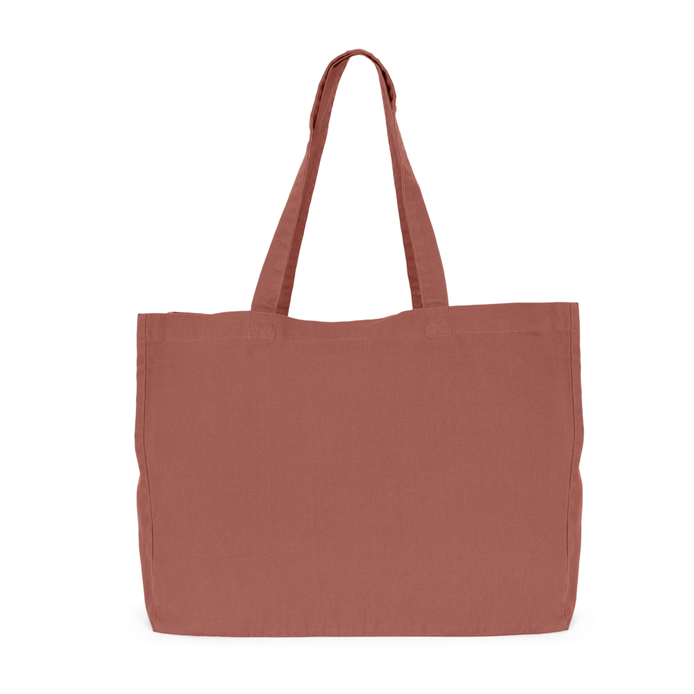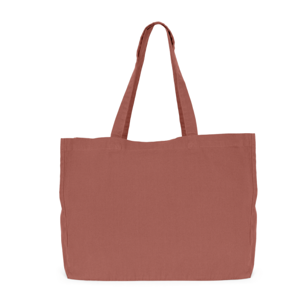 100% cotone. Grande borsa rettangolare con fondo piatto e ampio soffietto. Manici nello stesso materiale della borsa. Ampia capacità interna. I prodotti sbiaditi sono unici e potrebbero presentare leggere variazioni di colore.