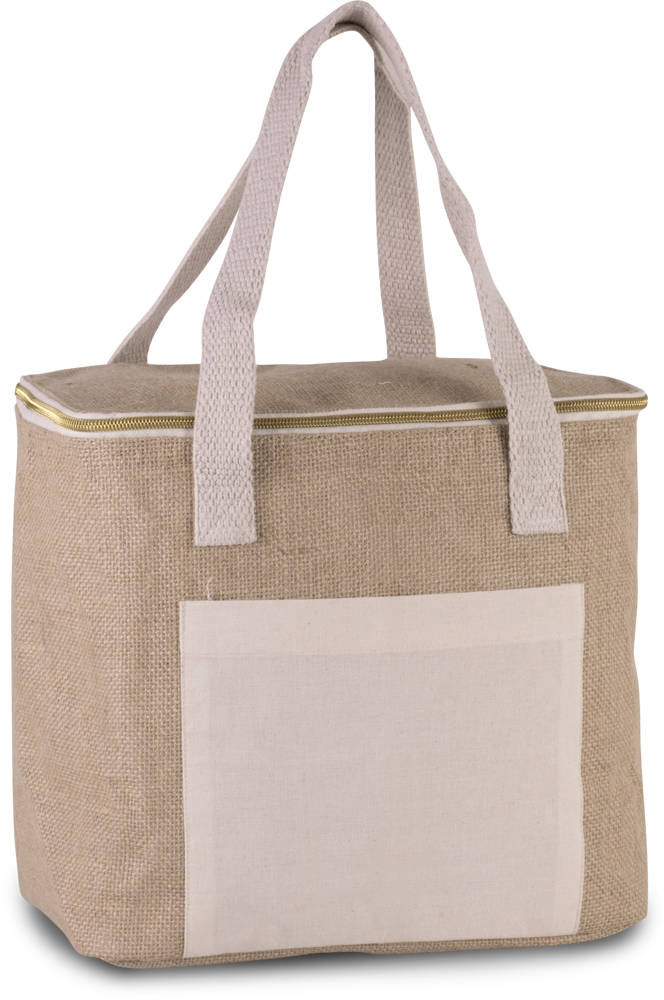 Borsa isotermica con esterno in tela di iuta e tasca in cotone per facilitare la personalizzazione, interno isotermico con fodera isolante in alluminio e schiuma isotermica ad alta densità. Manici in cotone. Modello medio.