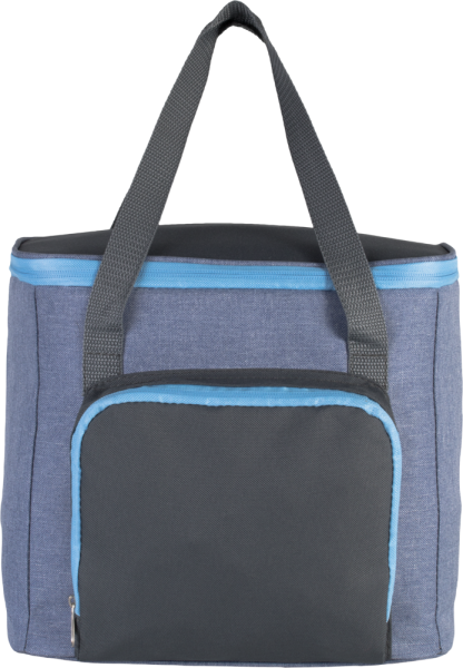 Borsa isotermica in poliestere 600D. 1 tasca con zip sul davanti per facilitare la personalizzazione. Manici e tasca di colore a contrasto. Può contenere bottiglie da 500 ml e lattine.