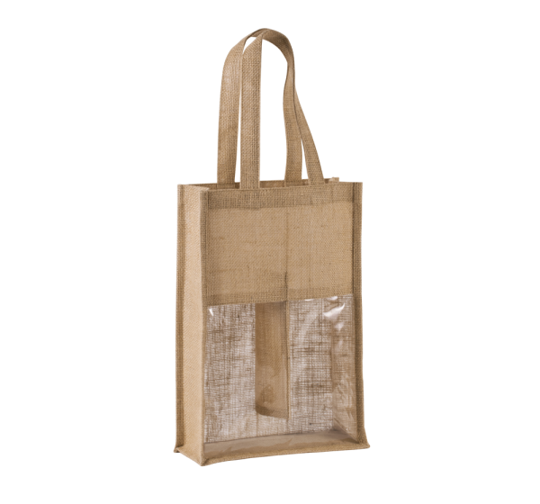 Borsa porta-bottiglie in tela di juta, con 2 manici e finestra trasparente sul lato anteriore. Ideata per 2 bottiglie.