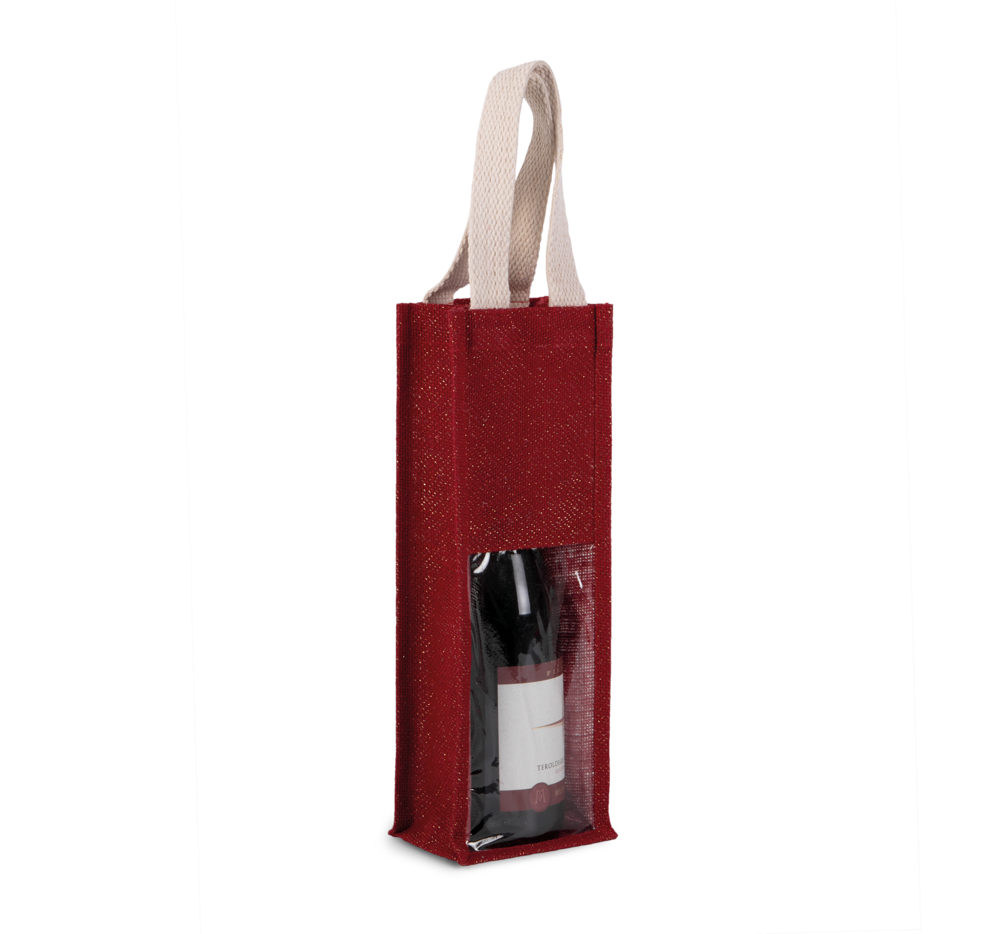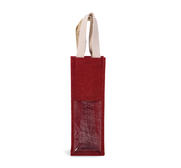 Borsa porta-bottiglia in tela di juta, con 2 manici e finestra trasparente sul lato anteriore. Ideata per 1 bottiglia.