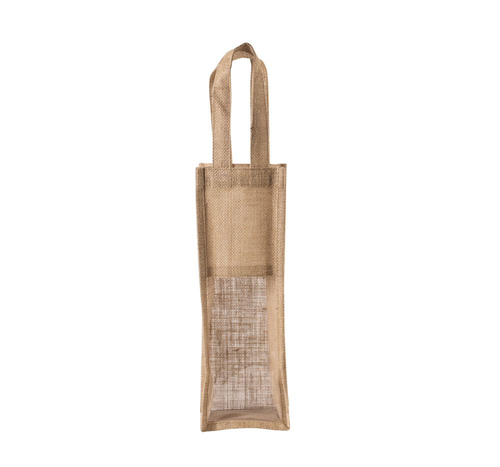 Borsa porta-bottiglia in tela di juta, con 2 manici e finestra trasparente sul lato anteriore. Ideata per 1 bottiglia.