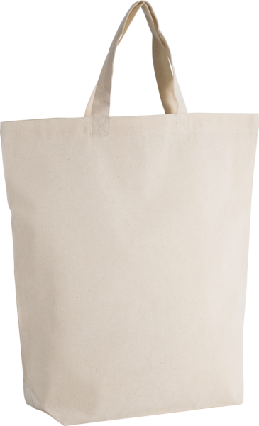Shopper in cotone a fondo largo con soffietto, manici da 35 cm nello stesso materiale e colore.