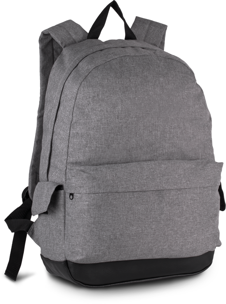 Zaino in poliestere 600D e finiture a contrasto. Scomparto interno imbottito per contenere un tablet o un computer portatile fino a 13". Spallacci ergonomici e schienale imbottito, 2 tasche laterali con patta e automatici.