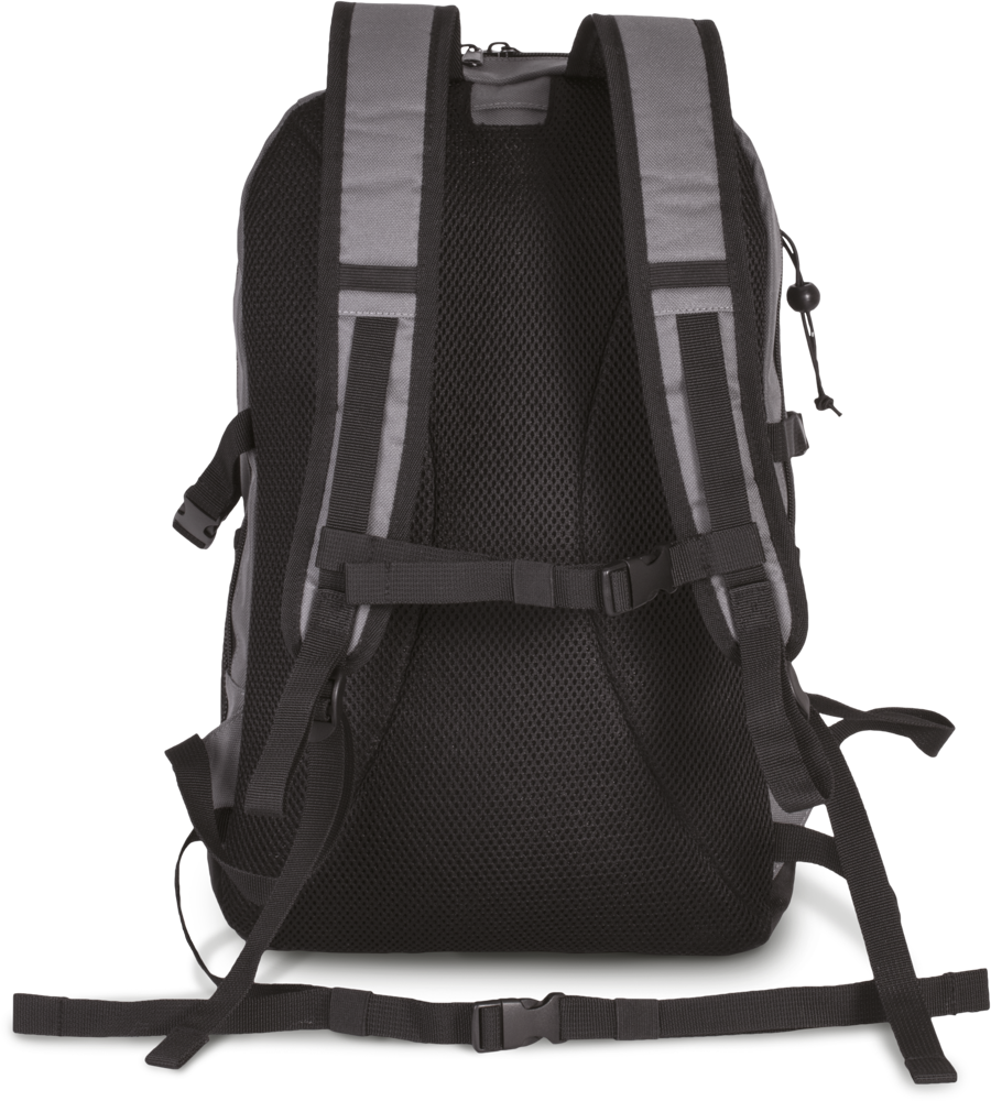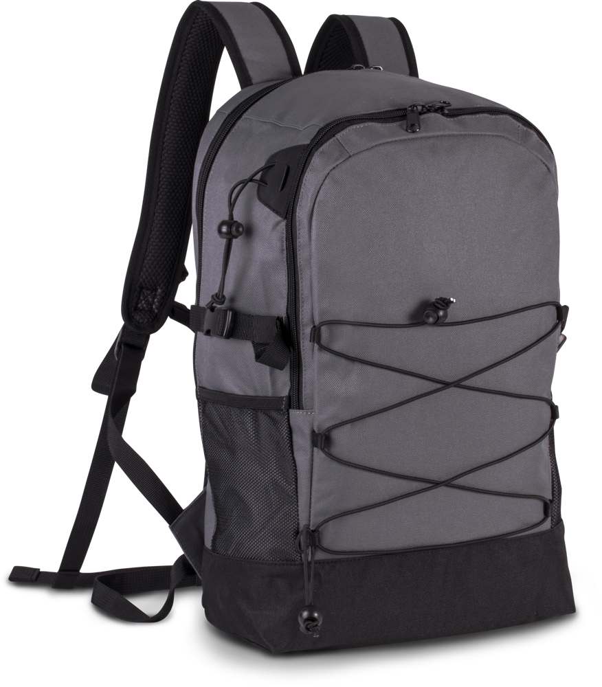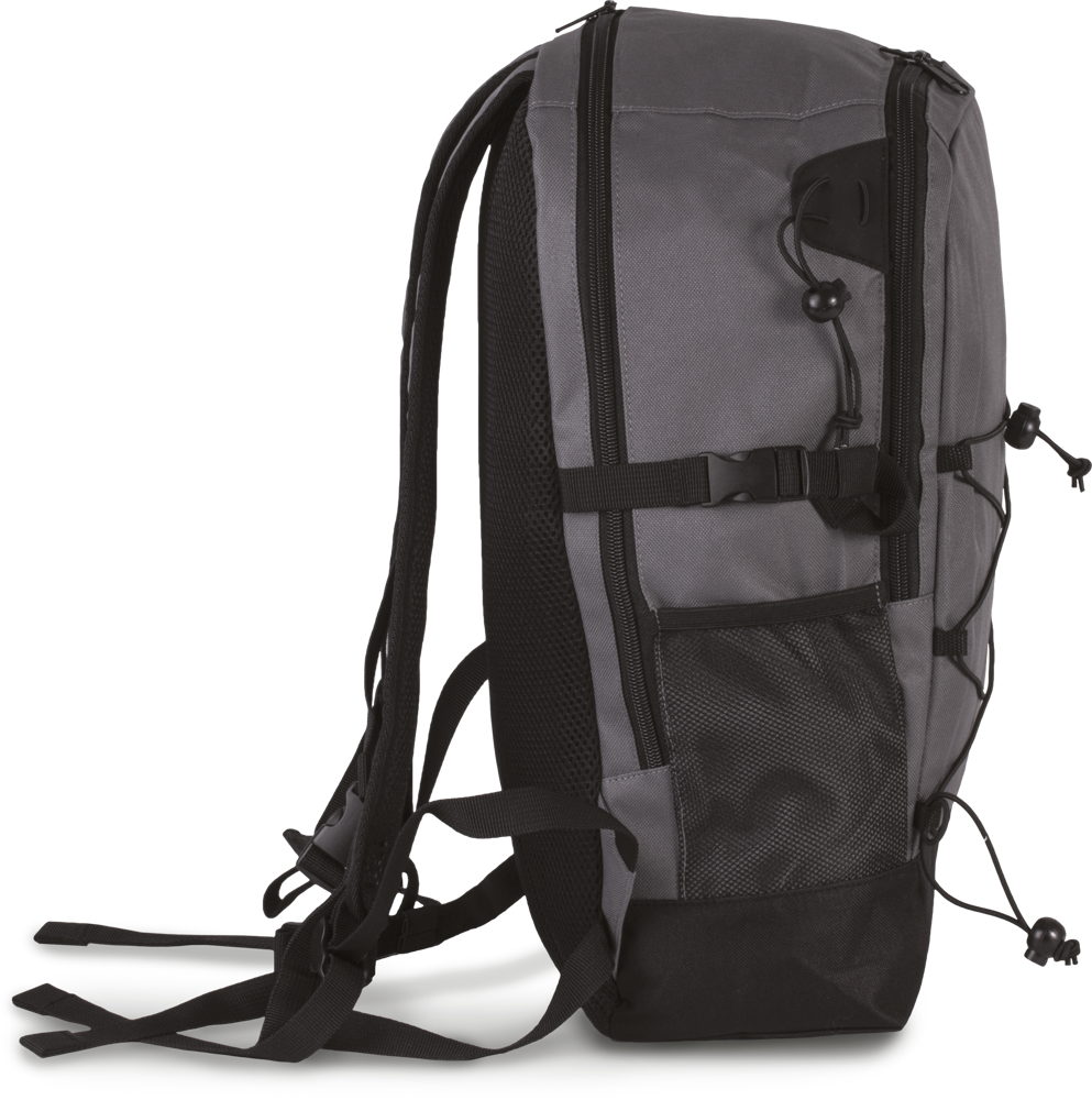 Zaino in poliestere 600D. 2 scomparti interni con 1 tasca con zip. Rete portaoggetti elastica sul davanti. Spallacci e schienale imbottiti e traspiranti. 2 tasche laterali in rete. Cinghie di sostegno in vita e petto regolabili.