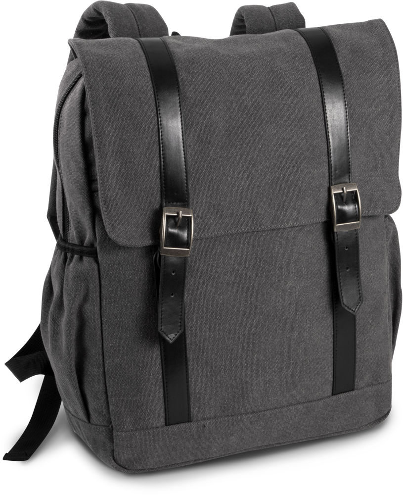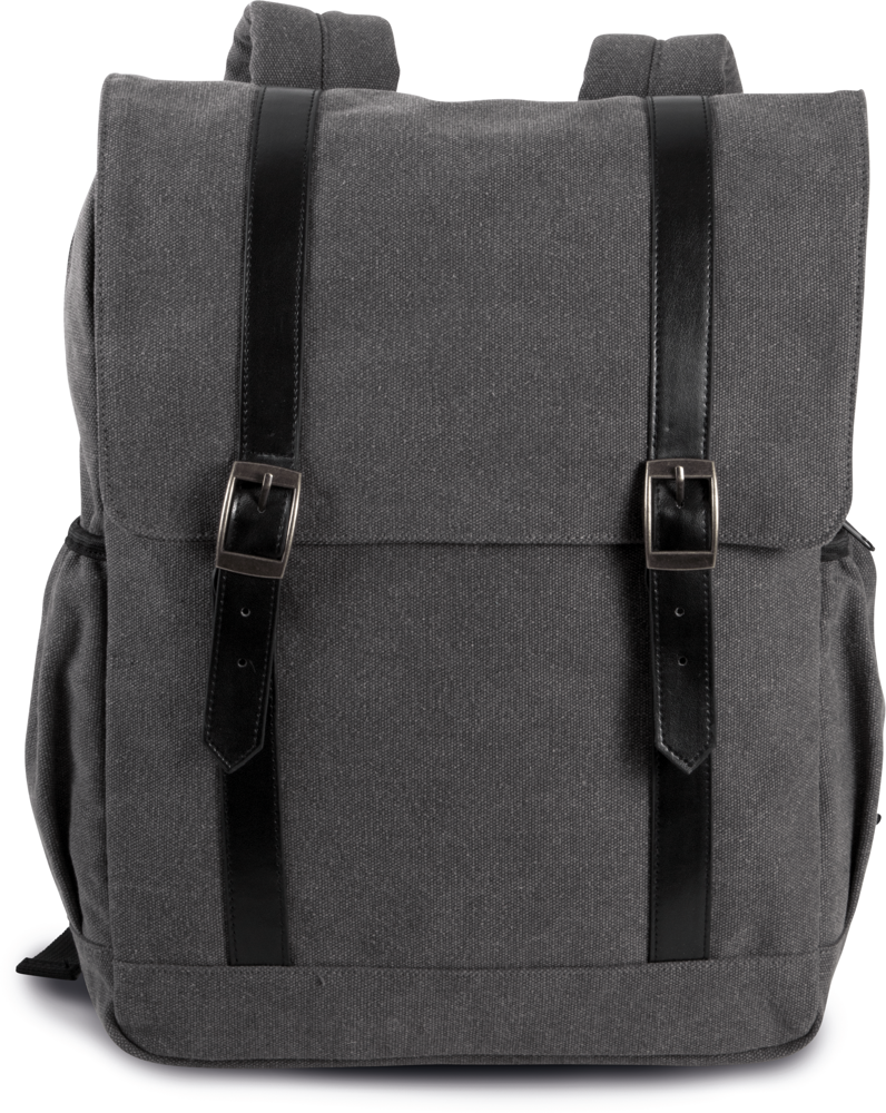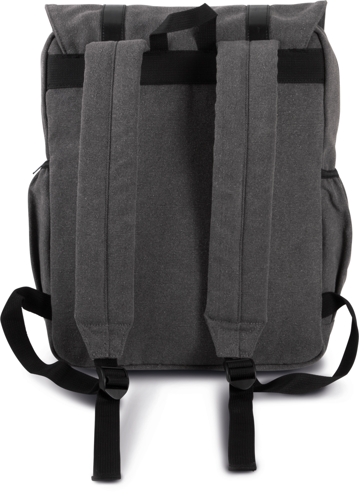 Zaino in tela di cotone con patta. Spallacci a contrasto con chiusura tramite fibbia in metallo decorativa ed automatici. Scomparto interno con zip adatto a contenere tablet e computer portatile fino a 13". Spallacci ergonomici e schienale imbottiti.
