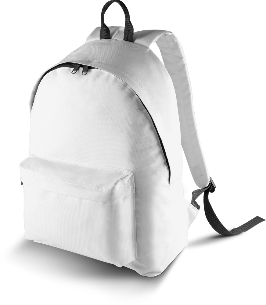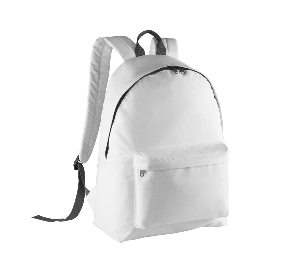 Zaino in poliestere 600D. Tasca frontale con zip, dorso imbottito, spallacci ergonomici regolabili. Versione junior del modello KI0130.