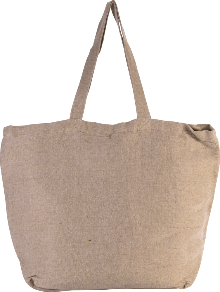 Borsone portatutto in tela di juta e cotone (juco). Fodera in cotone, tasca interna con zip, soffietto, manici da 65 cm negli stessi materiale e colore. Chiusura con automatico a calamita.