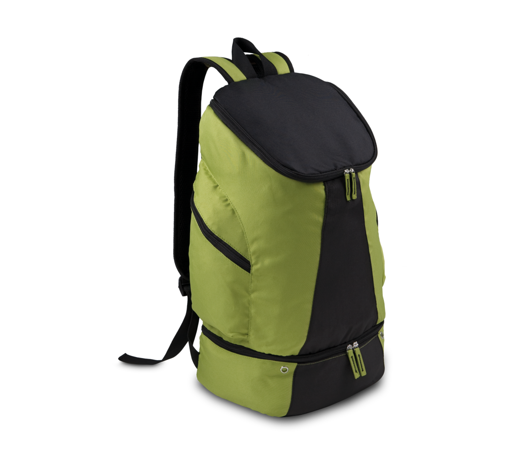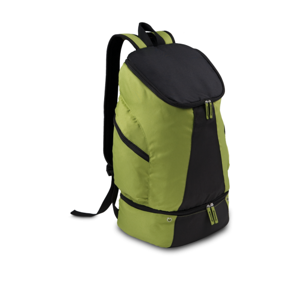Zaino sportivo in Poliestere 600D e Ripstop 300D. Grande scompartimento superiore e scompartimento inferiore porta scarpe con occhielli, schienale imbottito traspirante e spallacci regolabili imbottiti.
