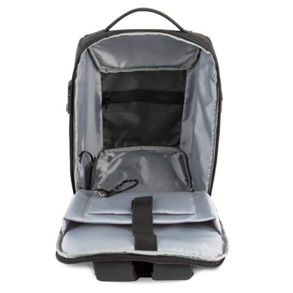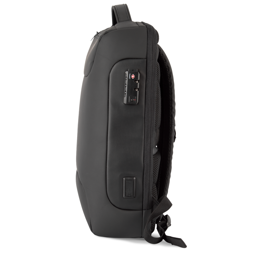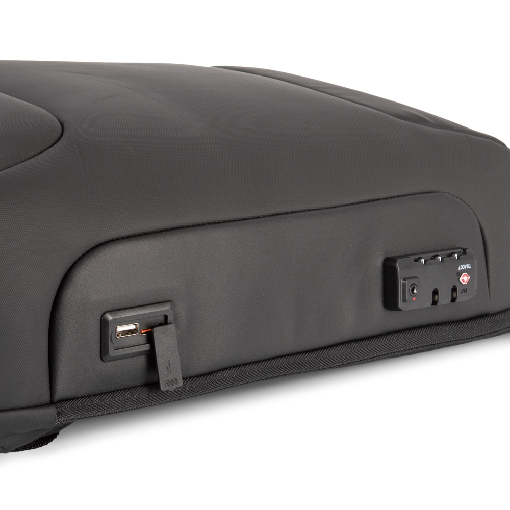 100% poliestere. Guscio semi rigido. Ampio scomparto principale per i documenti con tasca grande con zip in rete e scomparto imbottito per computer portatile (fino a 15 pollici) e tablet. Lo scomparto principale può essere bloccato mediante una serratura a combinazione TSA che protegge lo zaino da furti accidentali. Connettore esterno del tipo C e USB con cavo interno per collegarvi un power bank. Tasca laterale interna per il power bank. Tasca frontale con cerniera. Tasca laterale portaoggetti con zip. Nastro a strappo sullo schienale per fissare lo zaino alle maniglie di un trolley e facilitarne il trasporto. Schienale e spallacci imbottiti e traspiranti. Tasca invisibile sullo schienale, facilmente accessibile con lo zaino in spalla, ideale per tenere al sicuro oggetti quali passaporto, biglietti aerei o cellulare.
