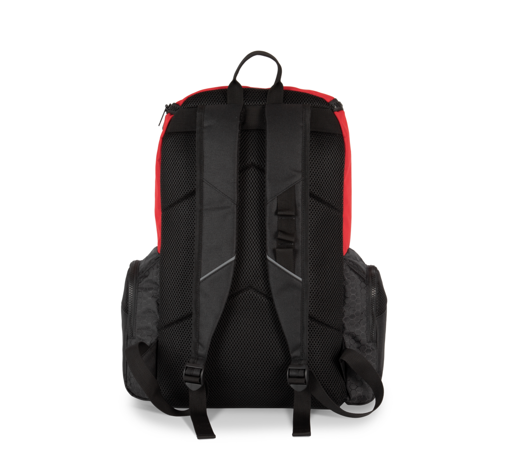100% Poliestere Zaino sportivo in 50% poliestere riciclato post-consumer. Grande tasca frontale con porta-scape e oggetti in materiale impermeabile che é ideale in sport aquatici per riporre materiale bagnato. Intaglio in rete traspirabile sia nella tasca frontale che laterali per garantire una ottima traspirazione.