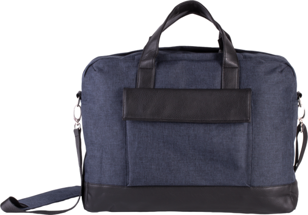 Borsa porta-computer in poliestere 600D. Fondo, cinghie e patta in poliuretano. Scomparto imbottito per contenere un computer portatile fino a 15" e tasca con zip imbottita per contenere un tablet. 2 tasche interne, 1 tasca con zip nella parte alta per contenere un cellulare, 1 tasca sul davanti con patta e automatici. Passante sullo schienale per fissarla a un trolley e spallaccio removibile.