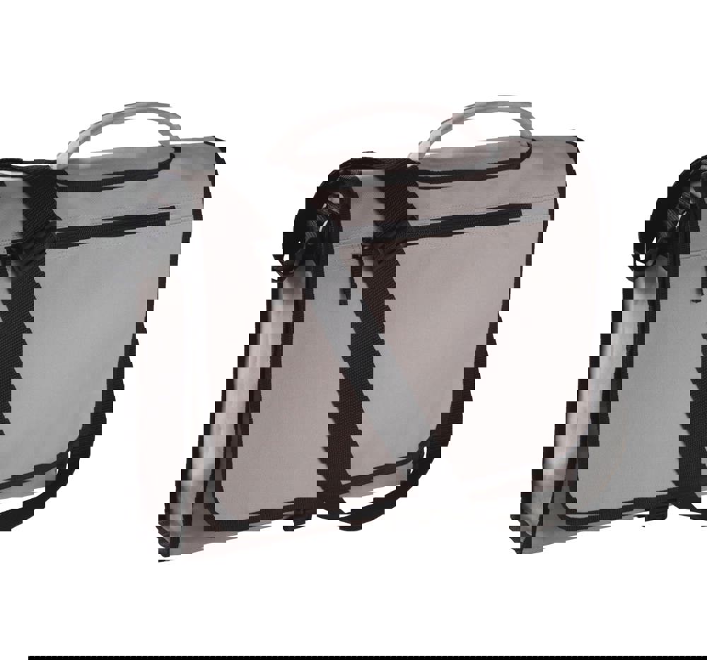 Cartella porta-documenti in poliestere 600D. Tracolla regolabile in webbing ad alta densitá, patella frontale con tasca a zip e chiusura con fibbia, porta penna e porta biglietti da visita, tasca interna.