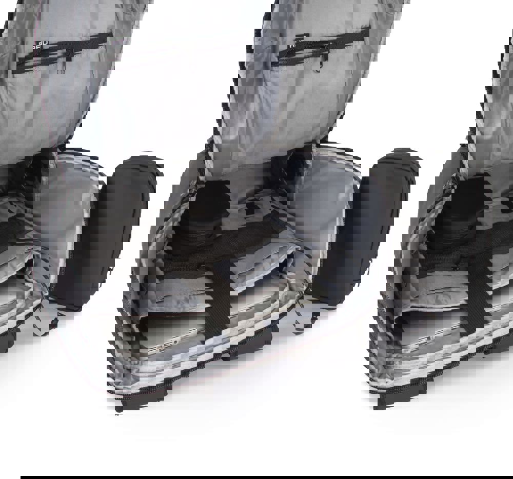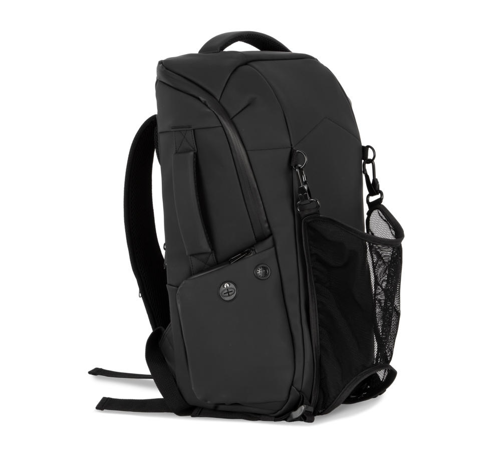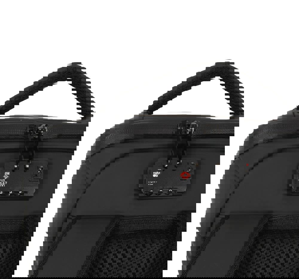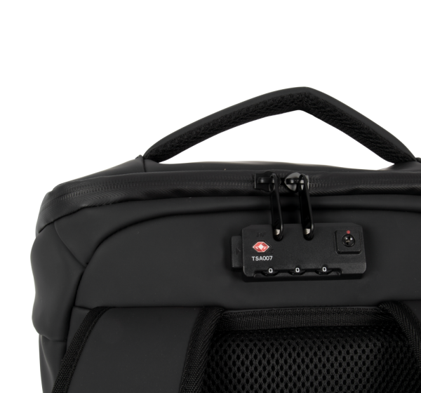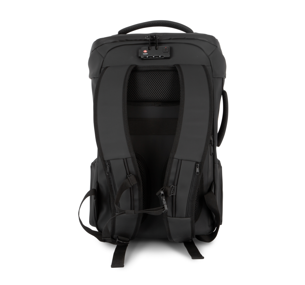 100 % poliuretano. Impermeabile. Rete elasticizzata amovibile porta-casco (da bici, monopattino, scooter). Sistema chiusura rete non adatto a caschi integrali. Sistema chiusura TSA a combinazione. Tasca laterale con cavo antifurto per agganciare lo zaino a tavolo/sedia. Tasca interna con protezione RFID contro scansione fraudolenta di dati da smart card/carte di credito. 1 tasca con zip su schienale, 2 tasche con zip su spallacci, 2 cinghie di fissaggio per giacca, 2 tasche laterali, 1 tasca di ricarica con USB su lato esterno, 1 porta micro USB (cavo incluso) su lato interno per Power Bank. All'interno: scomparto per computer portatile max 15'', scomparto per tablet max 11'', 2 tasche con zip in rete, 1 tasca per borraccia, 1 tasca per Power Bank. 2 tasche amovibili con zip per cavi/accessori.