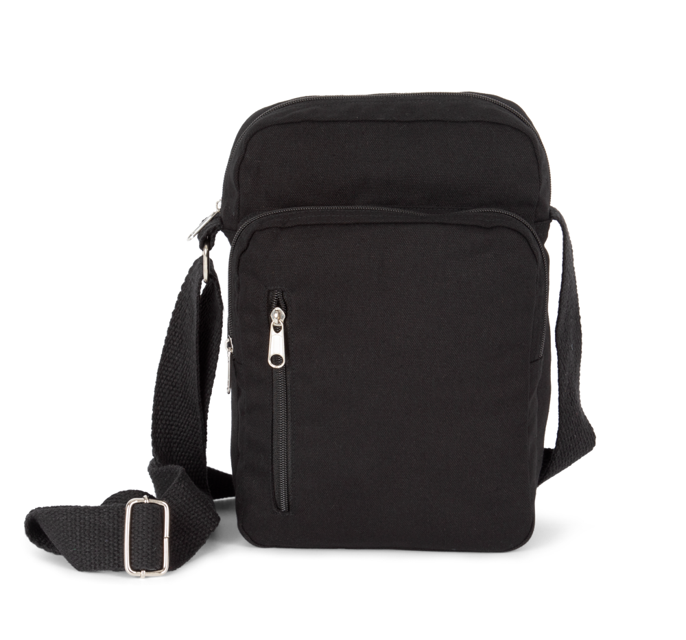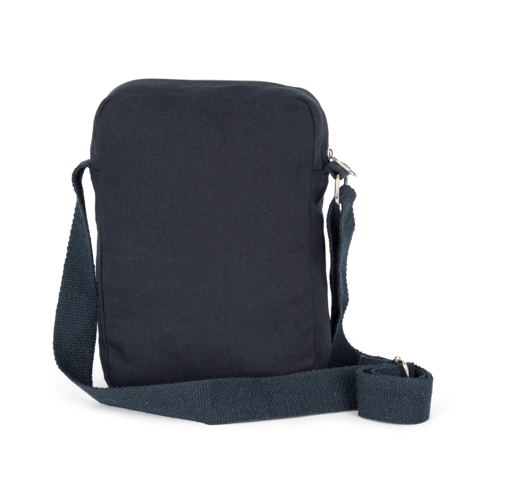 100% in cotone. Tracolla in cotone. Compatimento principale con cerniera. Grande tasca frontale con ulteriore tasca verticale con cerniera per facilitare la personalizzazione. Spallaccio regolabile.