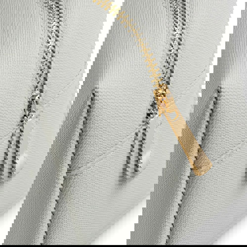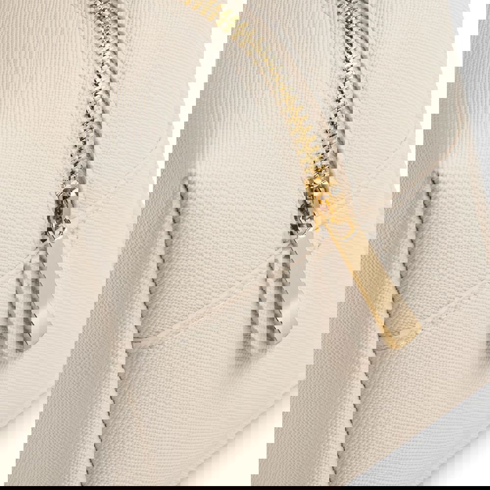 100% similpelle in poliuretano, pelle saffiano a grana fine. Trousse per accessori multiuso. Scomparto principale con zip e fodera morbida al tatto. Zip in metallo dorato brillante. Etichetta staccabile TearAway per facilitare la ri-etichettatura. Disponibile in due diverse misure (M e L).