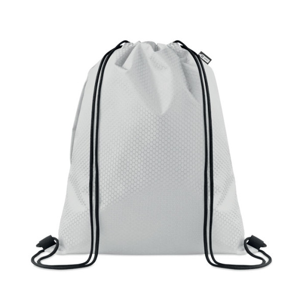 Drawstring bag in 420D RPET polyester with vertical side zip pocket and RPET 210D lining. Features durable cords on both sides. Capacity 4.5L, max load 5 kg.