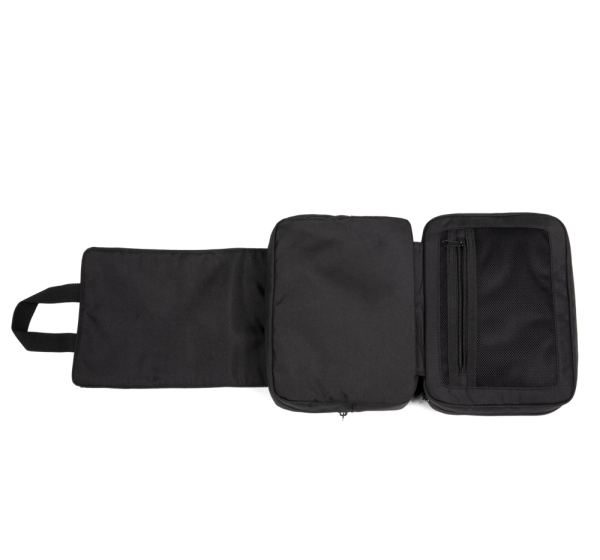 100% poliestere Necessaire in 50% poliestere riciclato. Doppio compartimento con cerniere che si chiude a libro con una salpa per facilitare la personalizzazione con doppia fibbia di chiusura. 2 maniglie per che permettono di appenderlo in verticale.