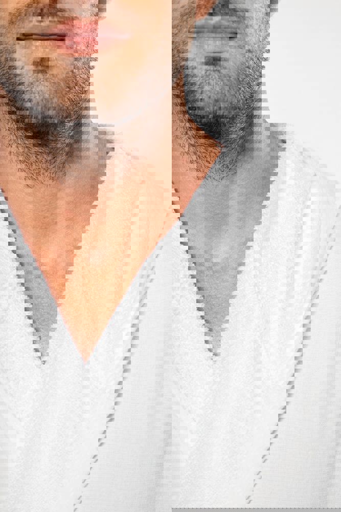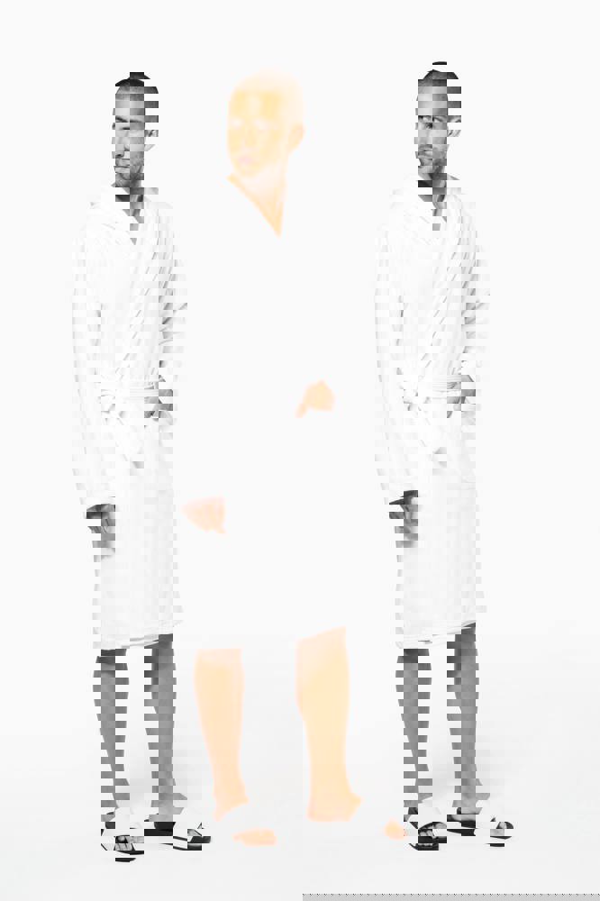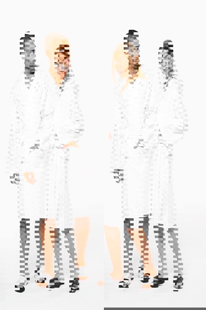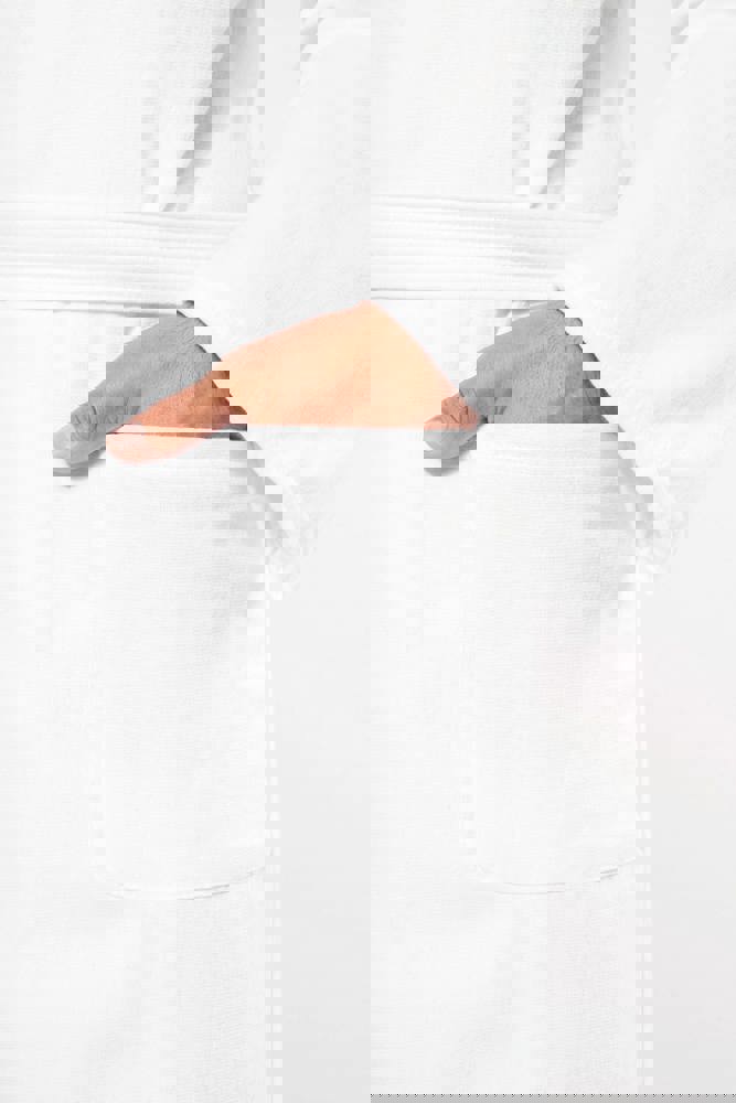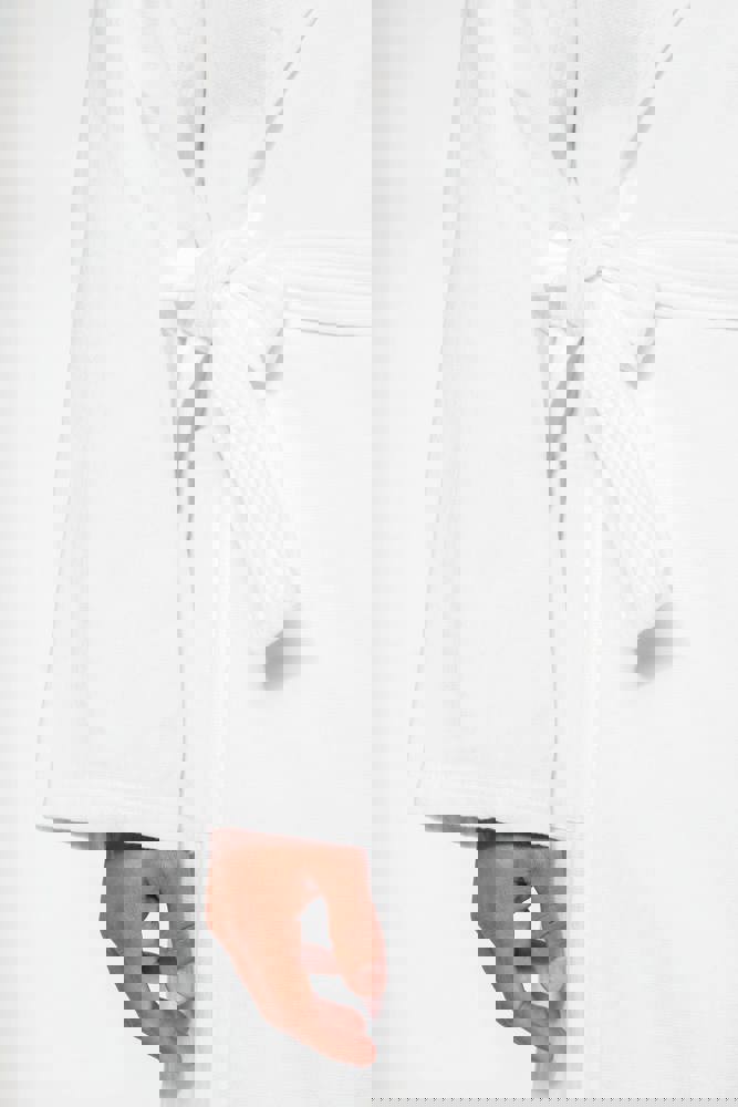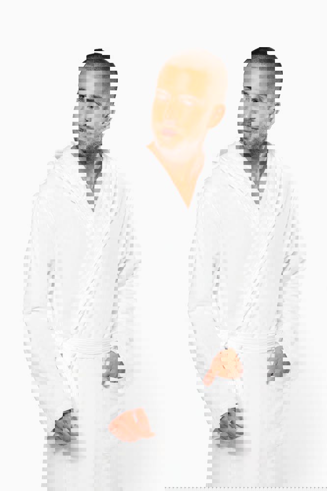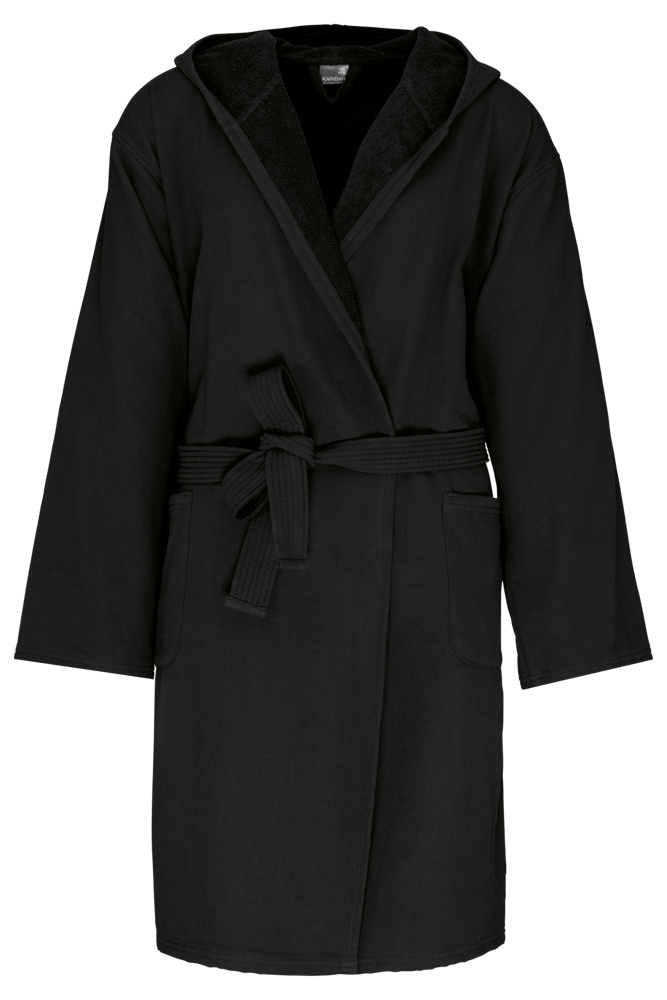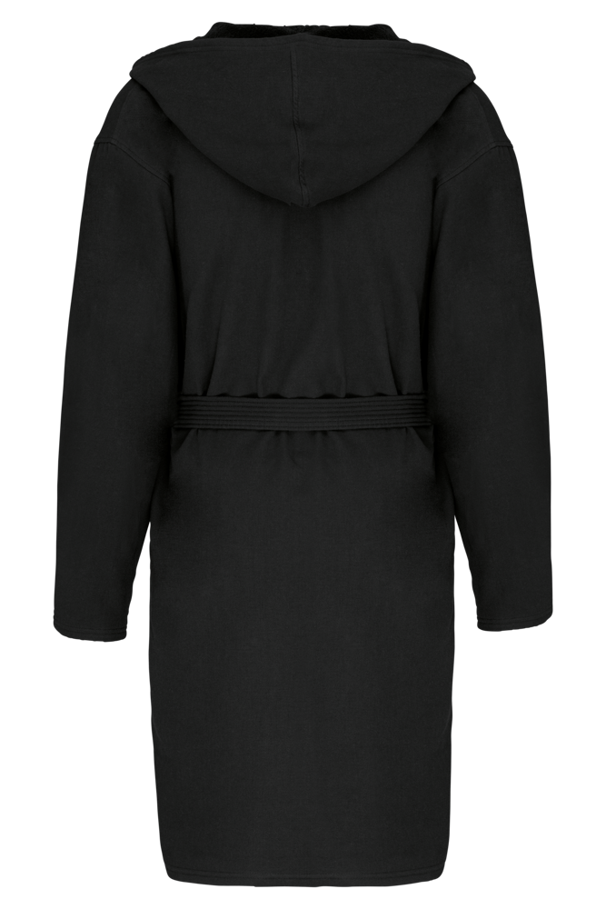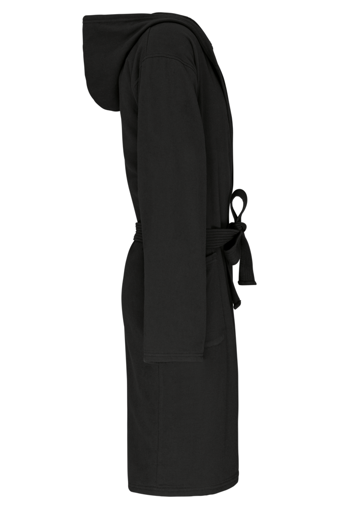 100% cotone biologico. Maglia Terry. Tessuto morbido e piacevole al tatto. Ampio cappuccio. 2 tasche laterali applicate con sovracucitura di rinforzo nella parte superiore. Girovita con passanti. Asola, per appendere il capo, cucita al collo. Finitura a doppia impuntura su bordo del cappuccio, fondo manica e fondo capo. Finitura tubolare a fondo capo e fondo manica.