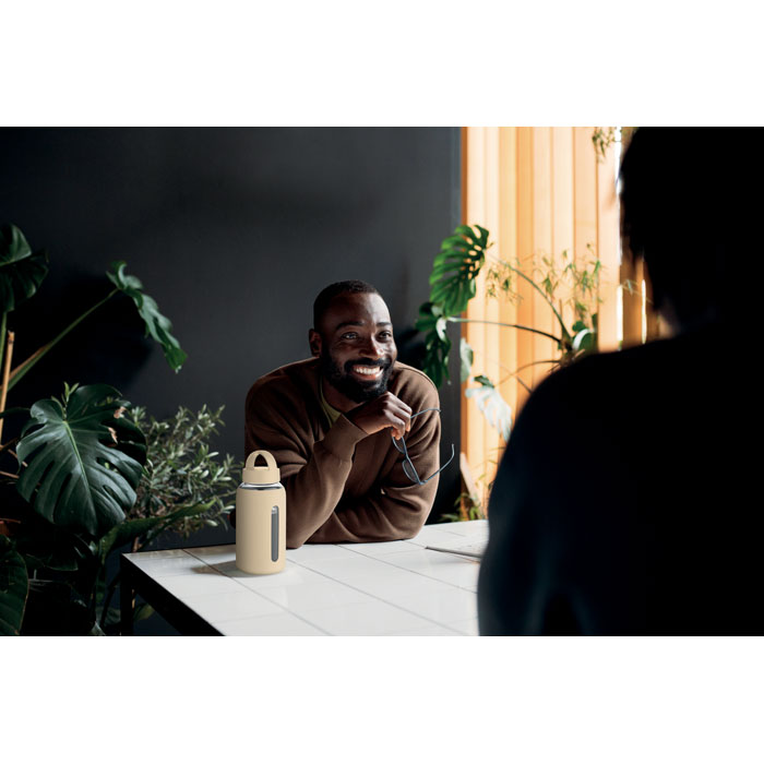 High borosilicate glass bottle with silicone pouch and PP lid with handle. Capacity: 600 ml