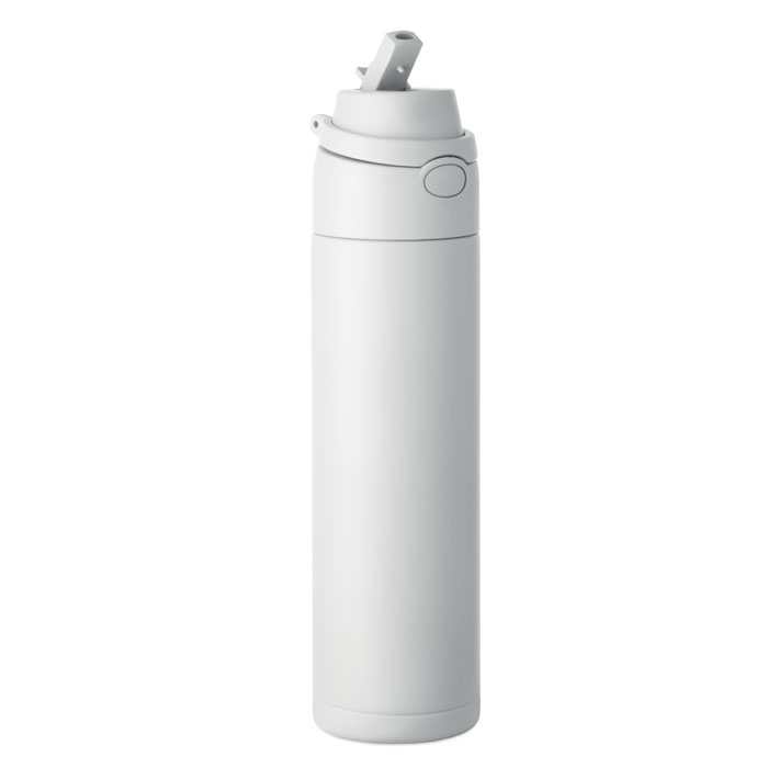 Single wall recycled stainless steel (90% recycled stainless and 10% stainless steel) bottle. Features 2-in-1 straw and sip PP lid with handle. Leak-free. Capacity: 650 ml.