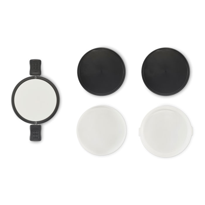 Two-tier round lunch box made of PP with side clip closure and handles. Includes inner lids.... more