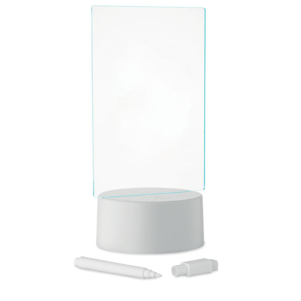 Light-up LED memo board with colour changing light and erasable white marker. Features acrylic board and PS base. Battery powered, requires 3 x AAA batteries (not included).