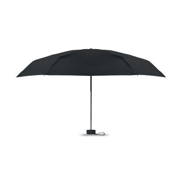 19-inch 5-fold manual umbrella made of 190T pongee with matching pouch. It has a metal and fibreglass windproof frame, black rubberized handle with wrist strap, and compact 17 cm folded size.