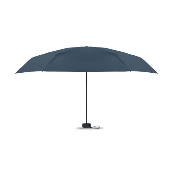 19-inch 5-fold manual umbrella made of 190T pongee with matching pouch. It has a metal and fibreglass windproof frame, black rubberized handle with wrist strap, and compact 17 cm folded size.