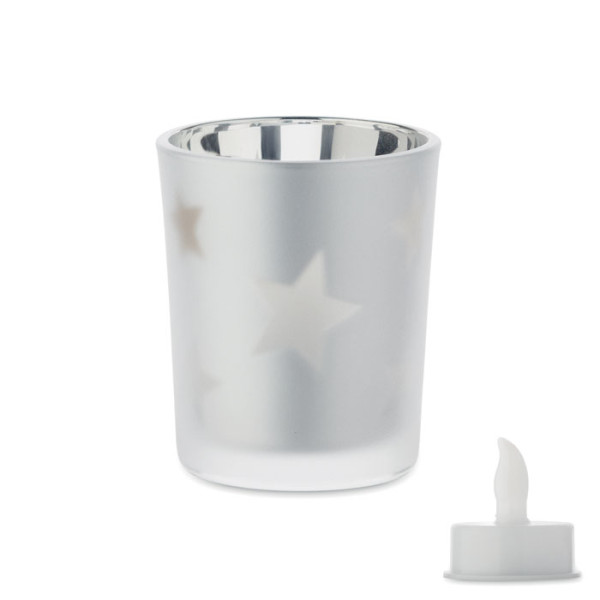 LED tea light in PP candle in glass jar. 1 button cell CR2032 battery included.