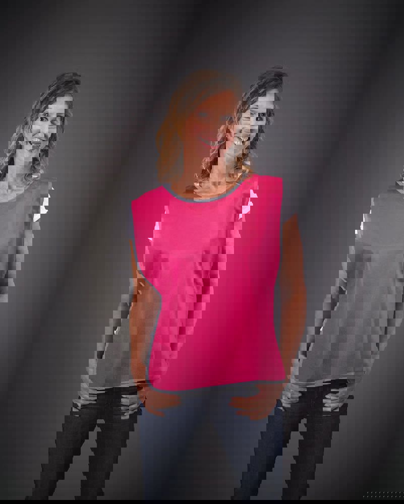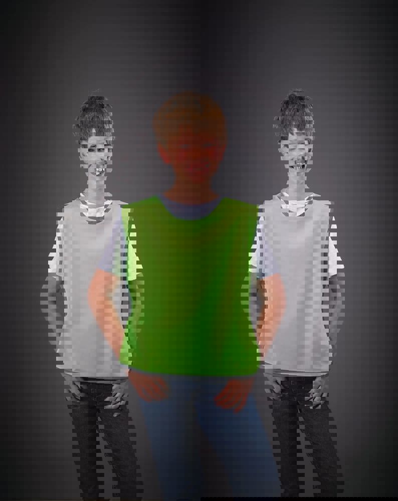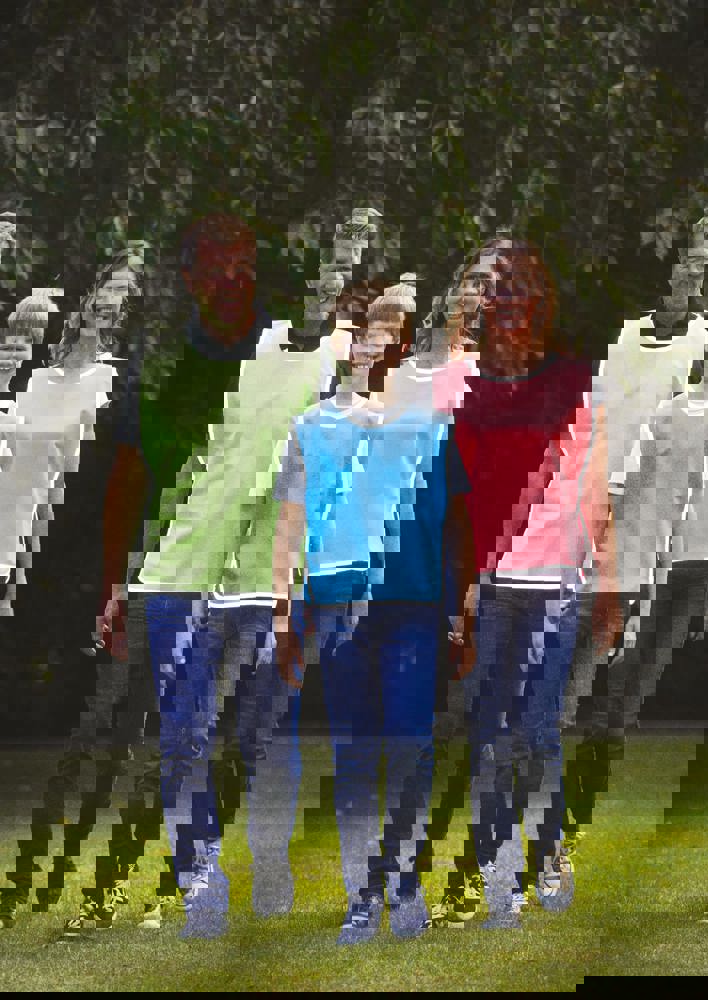 100% poliestere. Bordo riflettente. Elastico e fascia in Velcro di 10 cm su entrambi i lati. Ampia area per decorazione sul lato anteriore e su quello posteriore.