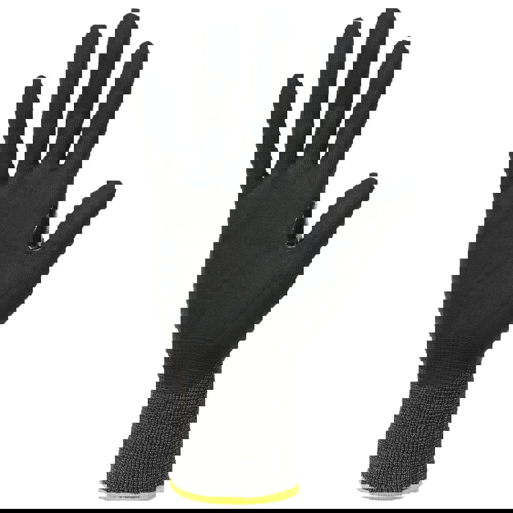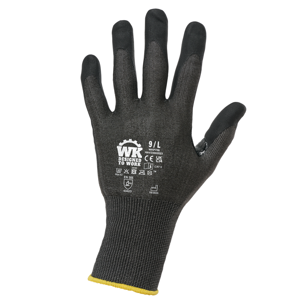 Materiale principale lavorato a maglia in MetalQ, poliammide ed elastan. Calibro 18. Spalmatura in micro-schiuma di nitrile su palmo e dita. Rinforzo in nitrile tra pollice e indice. Polsino elasticizzato con finitura a sopraggitto elasticizzata di colore variabile in base alla misura del guanto. Lavabile a 40°. Norme - EN ISO 21420: versione attuale / EN 388: versione attuale.
