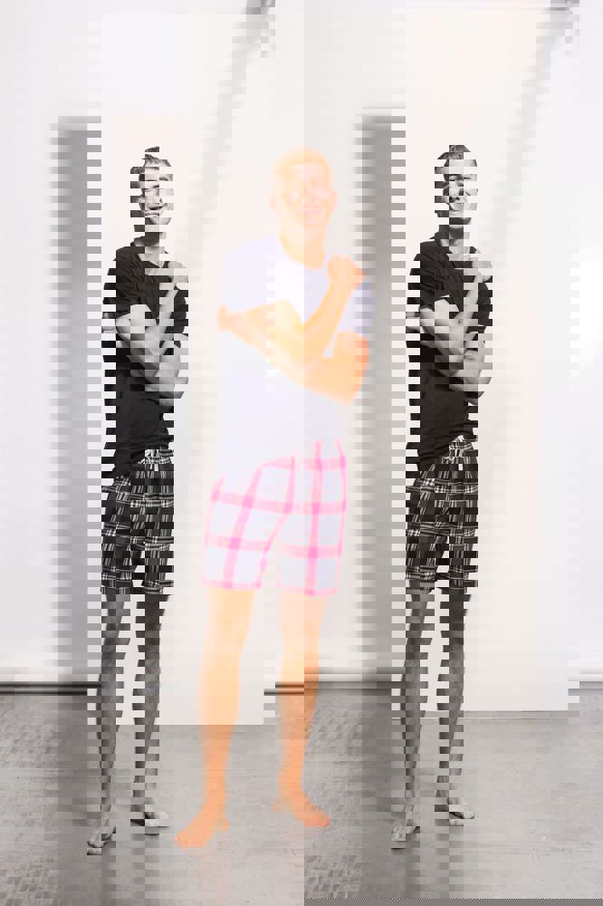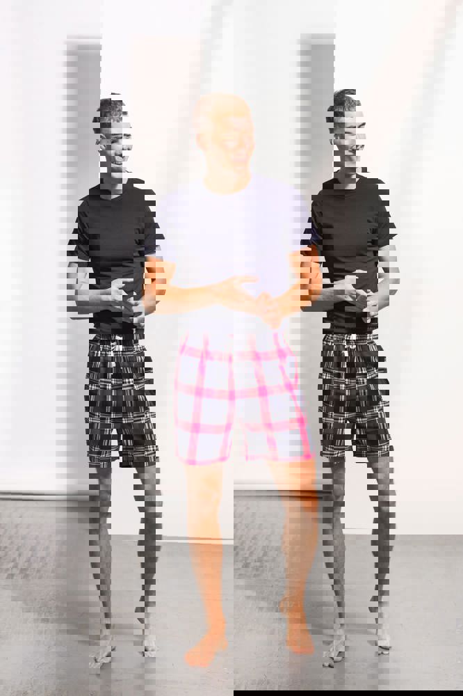 Flanella intessuta 100% cotone. Pantaloncini a motivo tartan con finitura sul bordo e tasca posteriore. Girovita elasticizzato con finta coulisse bianca. Etichetta staccabile.