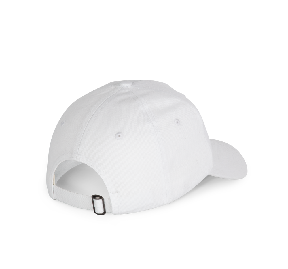100% cotone. Cappellino a 5 pannelli realizzato con il 60% di cotone riciclato pré-consumer e il 40% di cotone vergine. Fibbia di regolazione in metallo sul retro del cappellino.