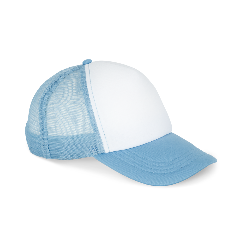 100% poliestere. Cappellino 5 pannelli. Area di personalizzazione con schiuma integrata sul pannello frontale e sulla visiera. Chiusura in plastica regolabile.