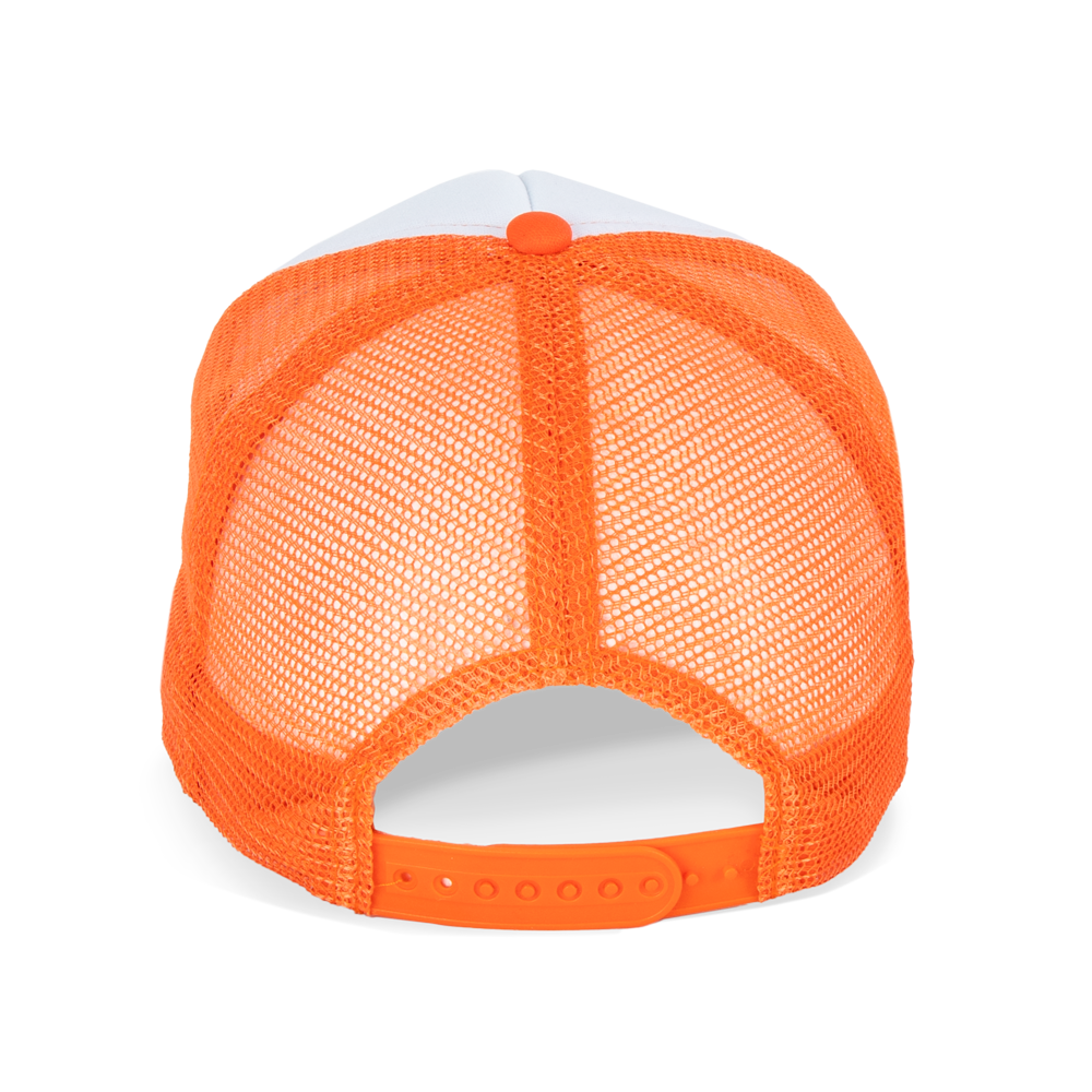 100% poliestere. Cappellino 5 pannelli. Area di personalizzazione con schiuma integrata sul pannello frontale e sulla visiera. Chiusura in plastica regolabile.