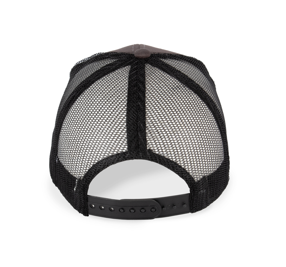 65% cotone / 35% poliestere. Cappellino Trucker a 6 pannelli con visiera a profilo medio e pannelli anteriori rinforzati tono su tono. Chiusura regolabile in plastica.