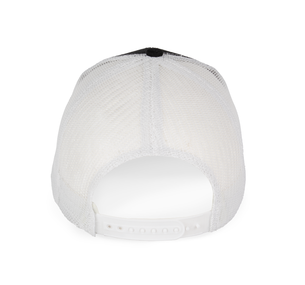 65% cotone / 35% poliestere. Cappellino Trucker a 6 pannelli con visiera a profilo medio e pannelli anteriori rinforzati tono su tono. Chiusura regolabile in plastica.