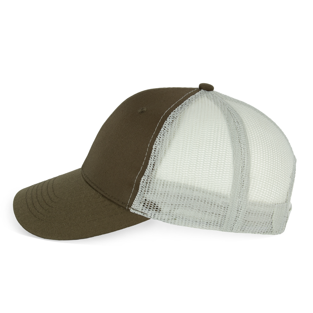 65% cotone / 35% poliestere. Cappellino Trucker a 6 pannelli con visiera a profilo medio e pannelli anteriori rinforzati tono su tono. Chiusura regolabile in plastica.