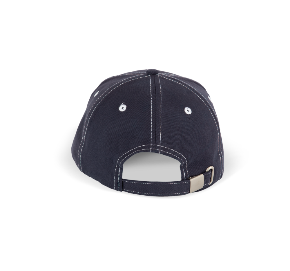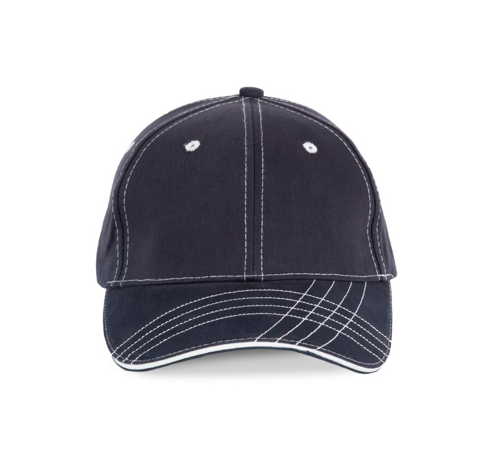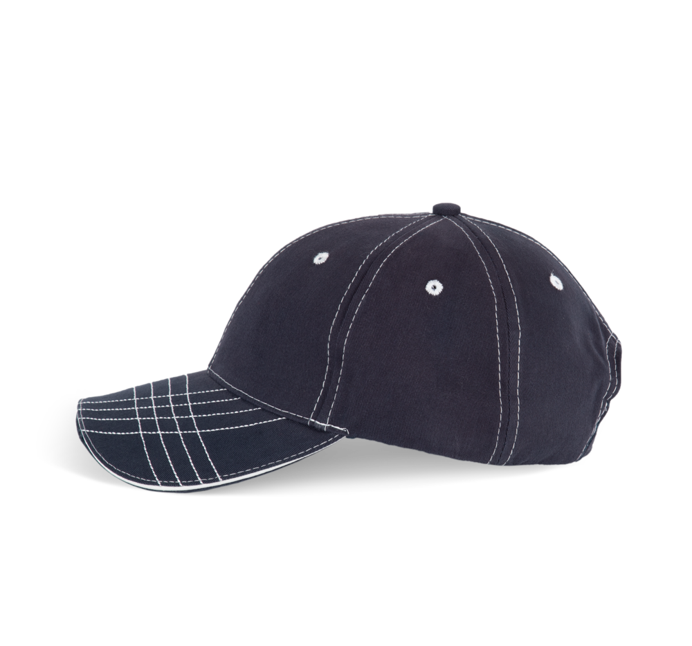 100% Cotone Twill. Cappellino 6 pannelli laminati. Occhielli e cuciture con colore in contrasto. Fascia anti-sudore in cotone.